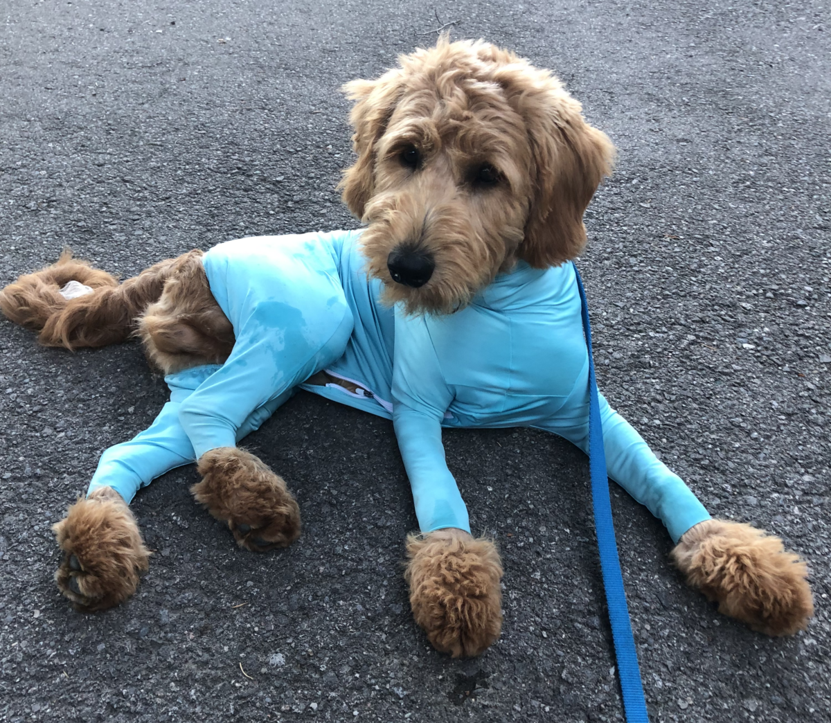 When Rebecca Greenstein gets her dog ready for a walk, she doesn’t simply attach a leash to his harness. Nay—Cliff, the vet’s goldendoodle, sports a light blue onesie.