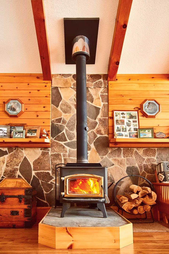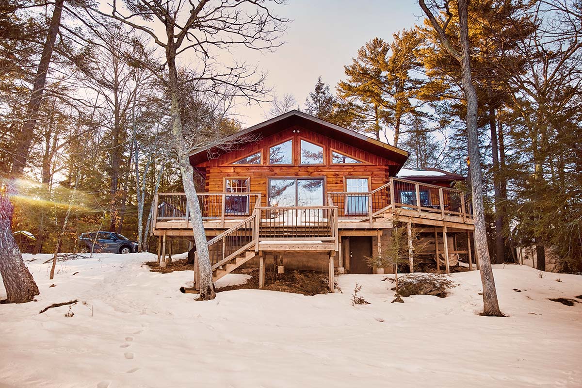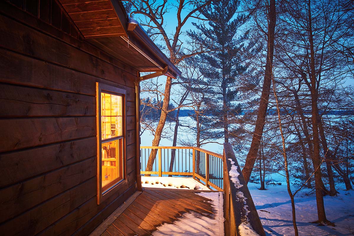 Winter cottaging is not for everyone, but as the saying goes, those who like it, like it a lot. Cindy and Dan Bartoli’s cottage isn’t fully winterized; its central heating system is a woodstove, supplemented as necessary by portable electric heaters. But they love it here in winter. Once the fire is roaring and dinner’s in the oven, the open-concept living area cozies up and holds the heat nicely. As a bonus, the leafless winterscape provides an even better view of the bay.