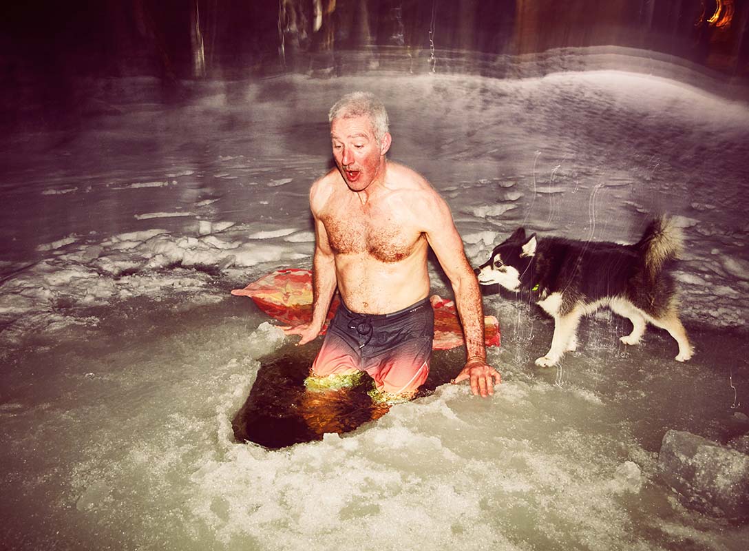 After 20 minutes in the dry sauna heat, it’s time for a dip. With total calm, Dan walks out to the triangle and lowers himself into the freezing water. He basks in it for a while before returning to the sauna. Steam rises off him like a slow-simmering human torch. I, on the other hand, a polar-bear-dip novice, can barely keep my composure as my lungs shrivel up in the water, then scamper back to the sauna like a lizard on its hind legs.