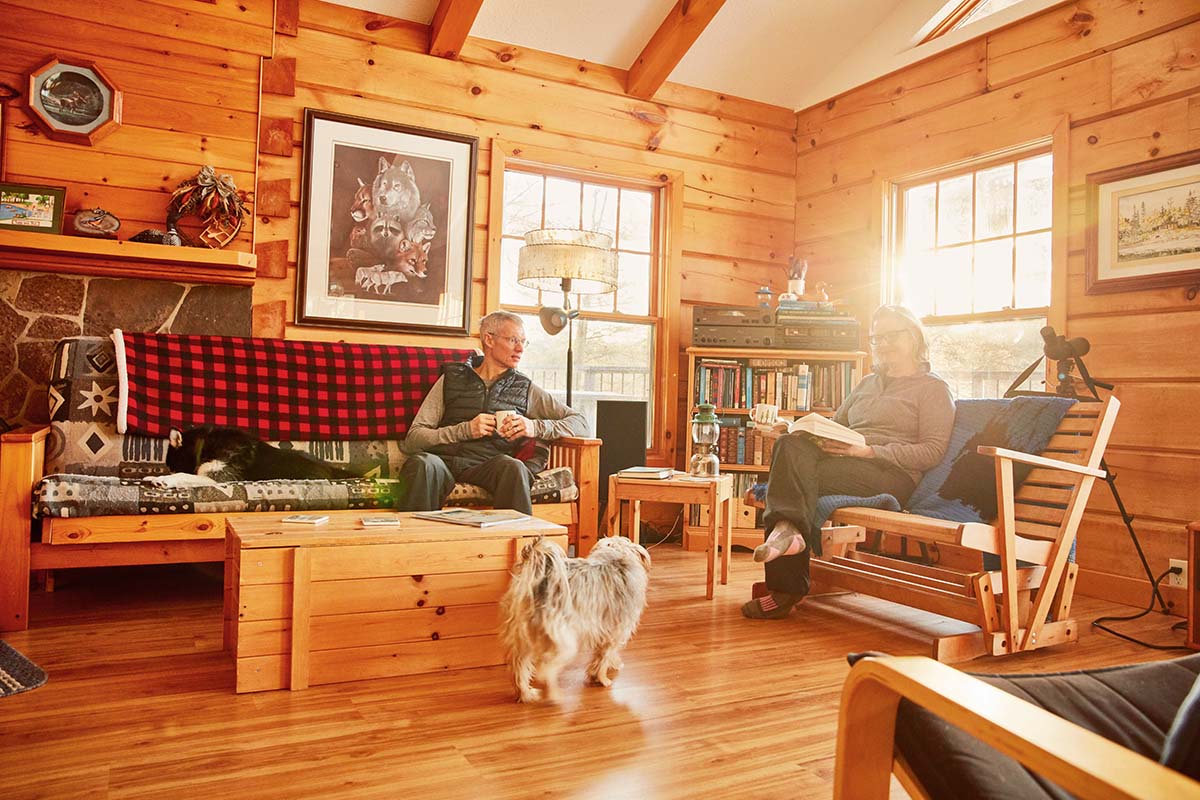 Dan and Cindy warm up in the living room. Two futons, Ikea chairs, and a rocking bench and chair give plenty of seating for times when their kids (Jake, 31; Trevor, 29; and Sadie, 27) visit.