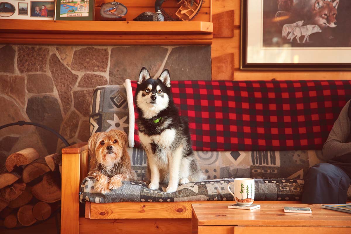 Cottage dog Bruce (on the right), a Pomsky