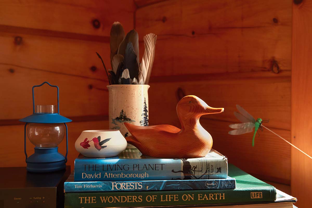 The cottage is an inspiring repository for Dan and Cindy's collection of natural history books, found treasures, and other artwork.