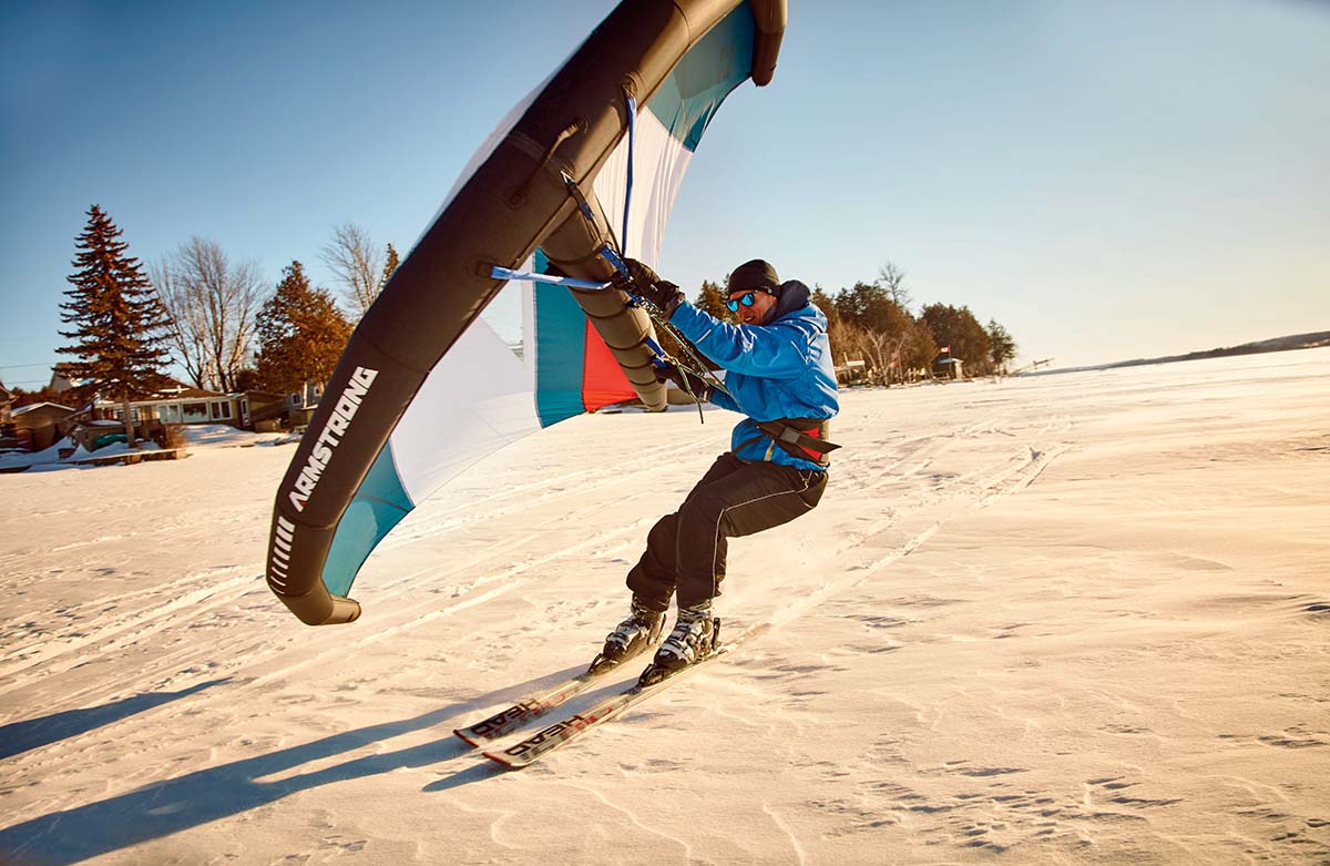 Their popularity has also been propelled by Covid-19. In fact, it was in the midst of lockdown-enforced web surfing ennui when Dan first discovered them. “We were going to go to Aruba with another couple to learn to kiteboard in the winter of 2020, but that trip fell through,” he recalls. That’s when he found some videos of winter wingers on skis and snowboards. The advantages, he says, were obvious right away. “There’s no way I could kite ski at the cottage because the lake’s not big enough. But I knew the wing could work.” He bought his A-Wing online for $1,300. Shortly thereafter, he was out in the field wowing his neighbours and, soon after that, woohooing on a frozen Gold Lake, just like he is now.