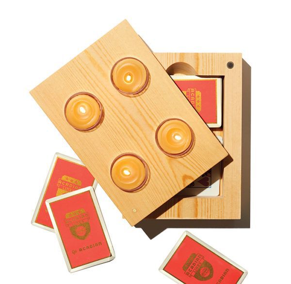 A pine tea-light holder with a secret: the top pivots to reveal a space inside sized for two decks of playing cards. Hidden in plain sight, your cards can be close at hand and safe from spills.