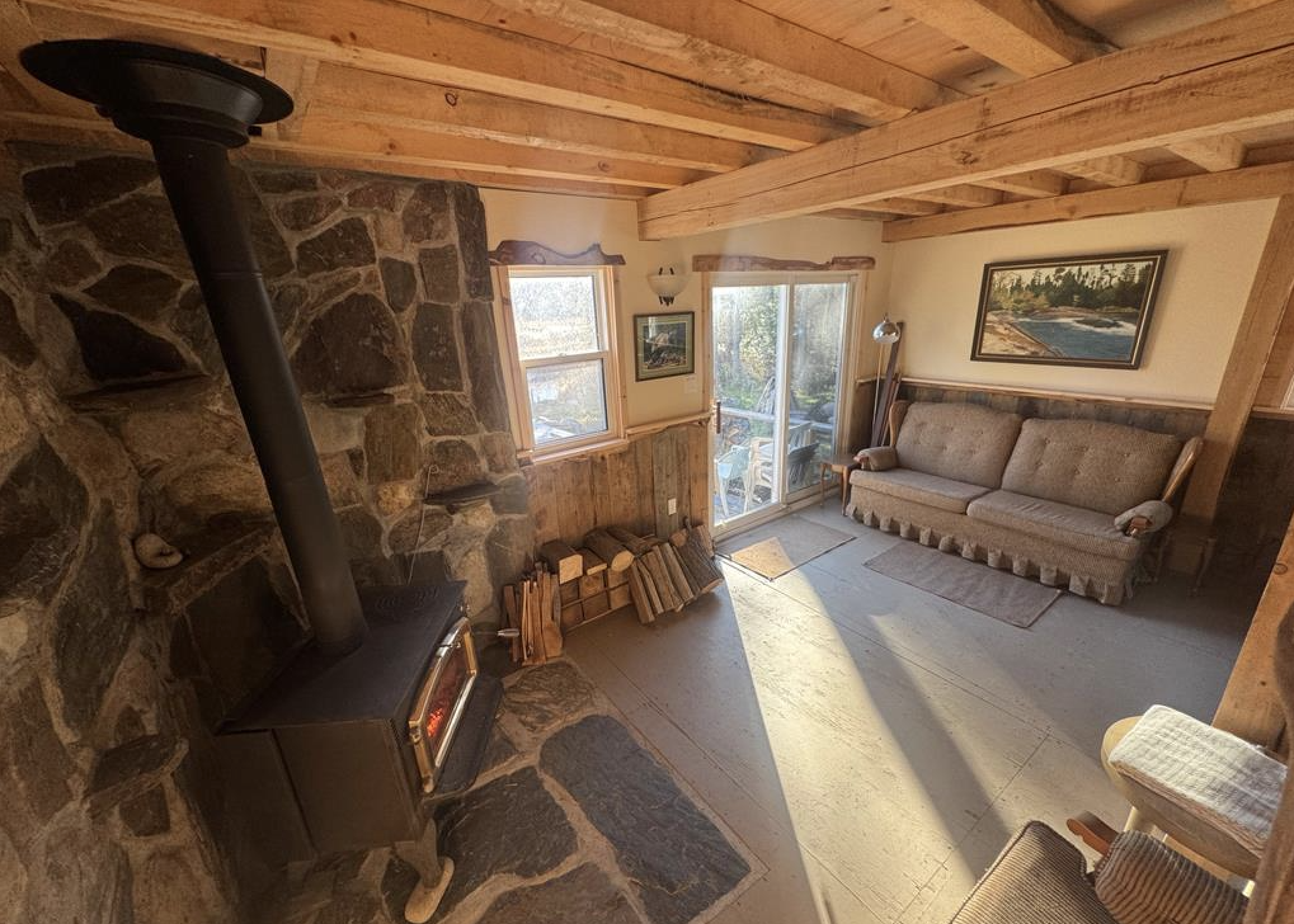 This two-bedroom, one-bathroom wood cottage in Havelock, Ont., sits on a 68-acre property with its own natural pond. The open-concept living room and kitchen feature a cozy woodstove in a stone nook and bright windows. A twenty-two foot pine tree is built into the centre of the abode, winding up onto the second level. Accessible to Havelock and Marmora by car in the summer and by trail in the off-season, this property is surrounded by nature. Outdoor enthusiasts will enjoy nearby trail access for snowmobiles and ATVs, cross-country skiing, and sledding.