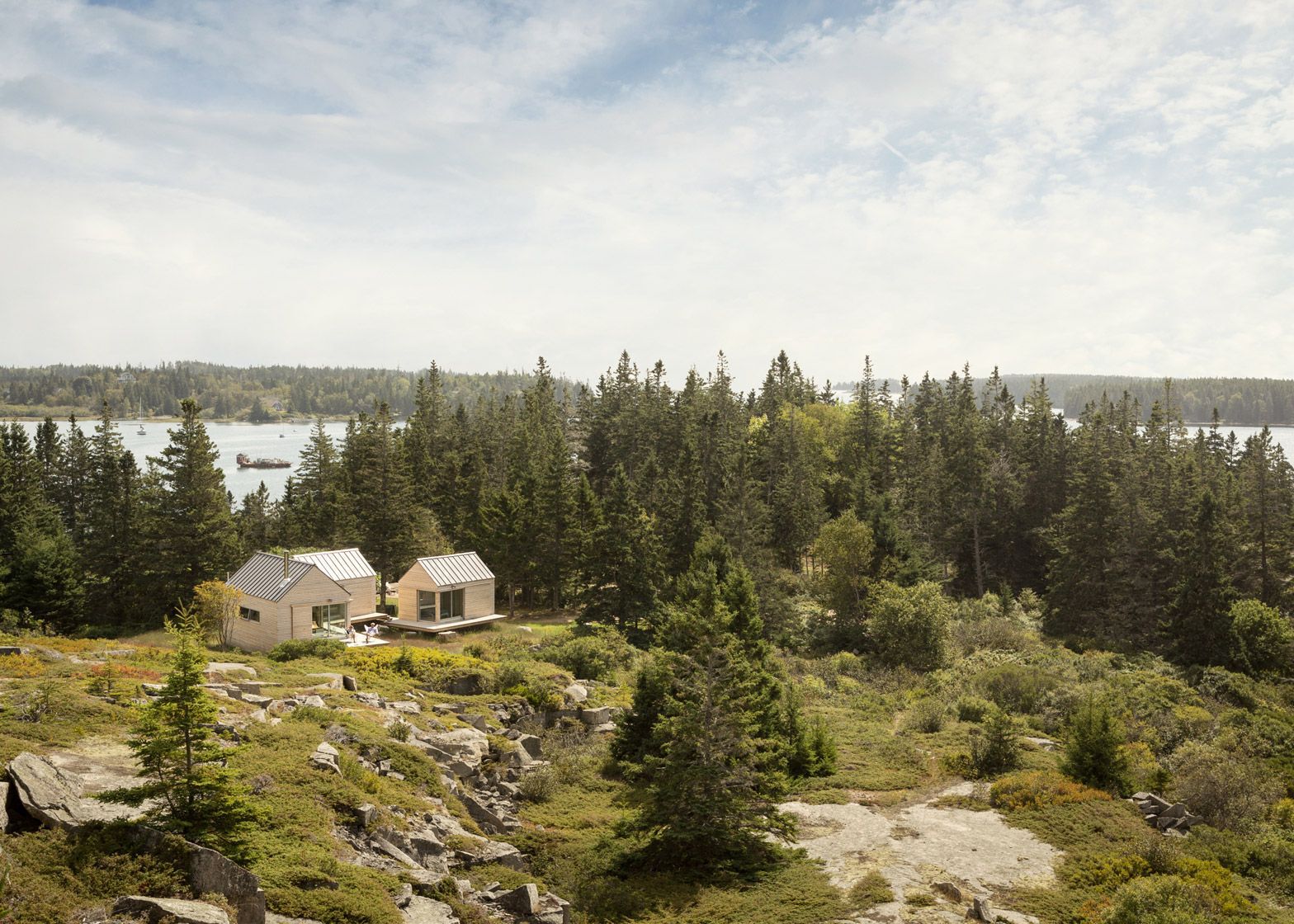 Some architects might have taken one look at the uneven ground and thought, “This is no place for a summer home.” But when GO Logic saw the remote site on the lobster-fishing island of Vinalhaven, Maine, they saw a possibility. Taking advantage of the sloping terrain, the architects built a series of tiny cabins, each elevated on wooden platforms and connected by walkways. A living room and kitchen are inside the main cabin, while two bedrooms with ensuite bathrooms are tucked inside the other two buildings. The size of the three cabins is just 890 square feet altogether.
