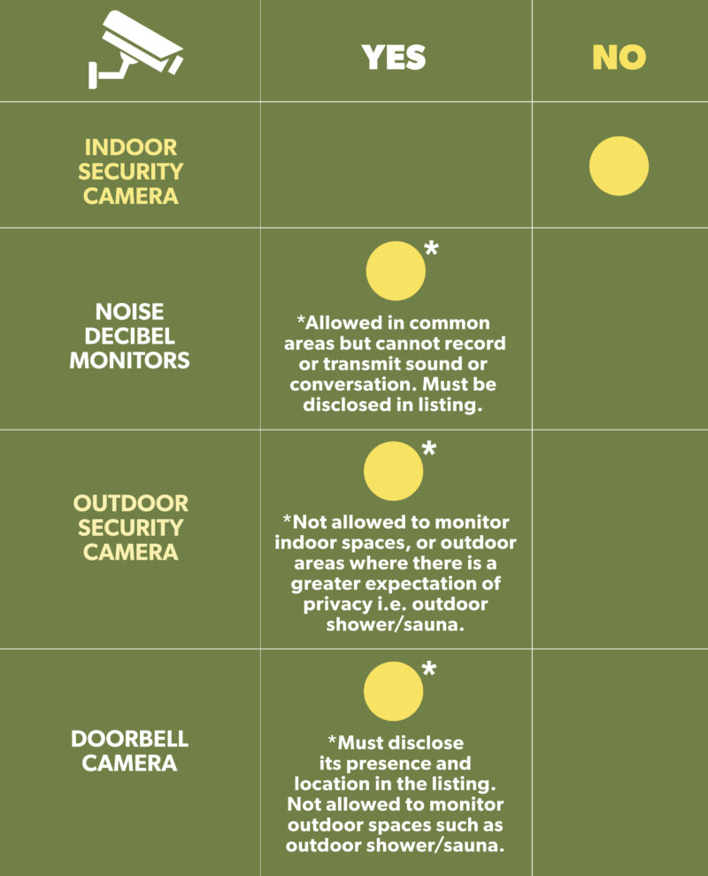 “You should definitely have an agreement [in place] before your property is rented so the guests know the terms and conditions of the rental, i.e. that they are required to keep the noise within a certain level,” she says. “That’s the kind of thing you should have in place, not security cameras and noise devices inside.”