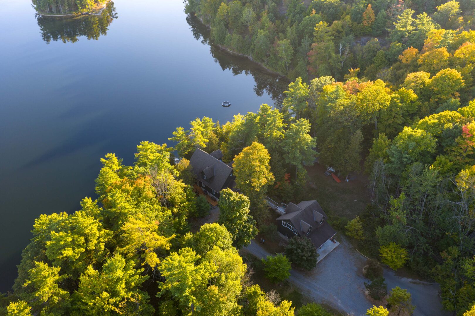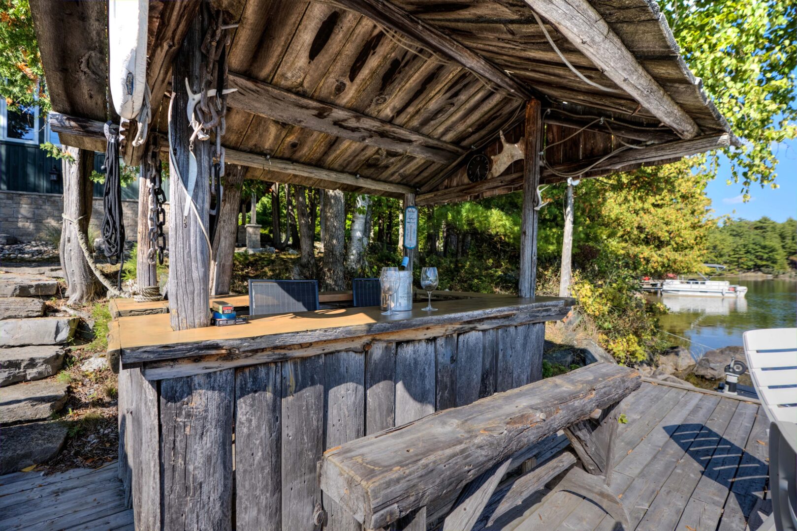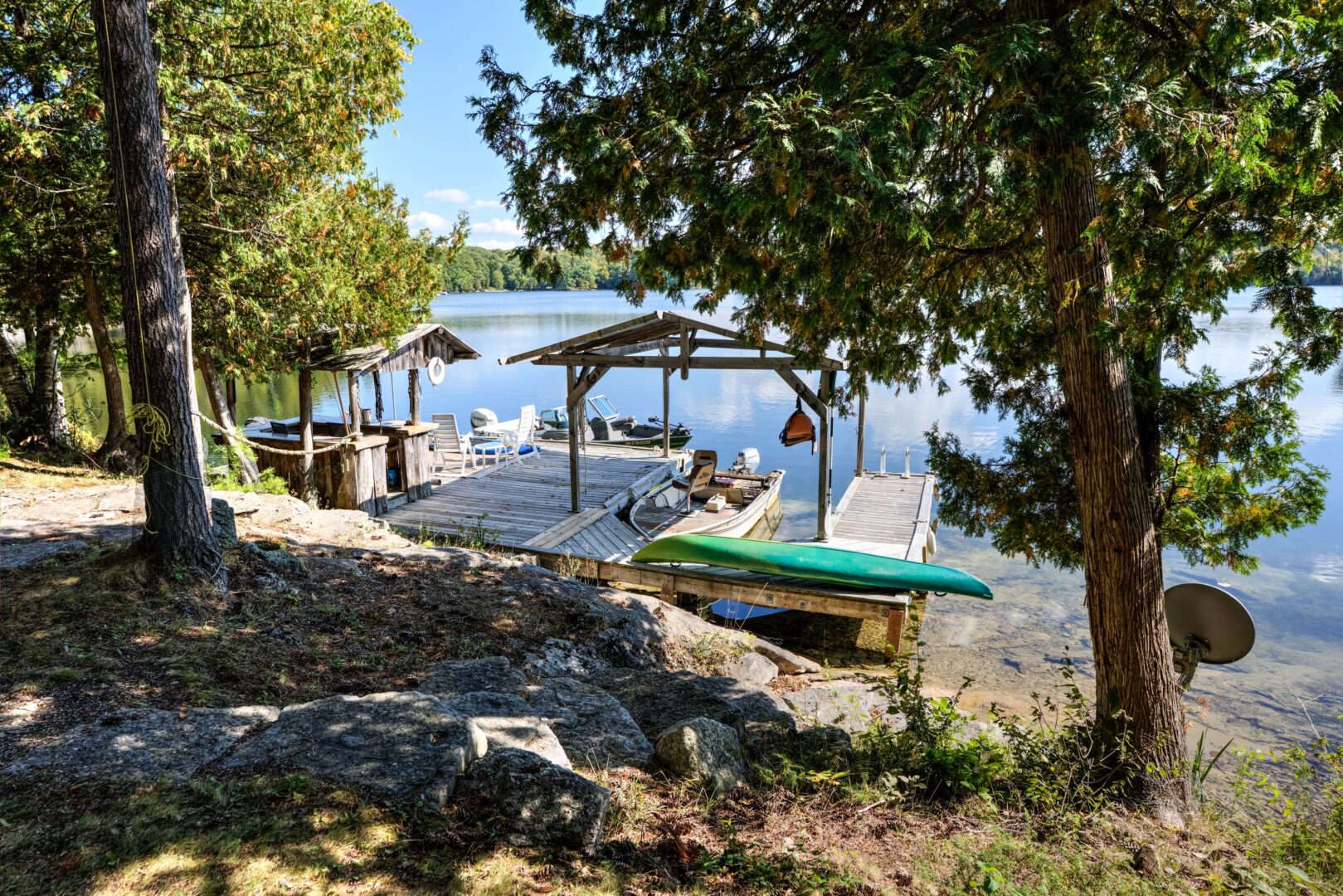 This three-bedroom, two-bathroom cottage is located at the north end of Buck Lake overlooking a sprawling bay with picturesque views. Situated on more than two acres of land and boasting 200 feet of private shoreline, the property features shallow entry into the lake, a large aluminium dock, and a covered boat slip. A custom-built tiki bar is located right on the water, perfect for entertaining guests and hosting happy hours. Inside the cottage, the main floor has an open-concept kitchen, a dining room, and a living room with direct access to the back deck. You’ll find the main bedrooms on the top floor as well as a laundry room and an office that could be converted into additional sleeping space. A bunkie that also functions as a detached two-car garage is connected to the main cottage via a catwalk, and it includes an extra bedroom, a two-piece bathroom, and a small kitchenette. With its deep, clear waters, Buck Lake is home to trout, pike, and large and smallmouth bass, making it an ideal choice for anglers.