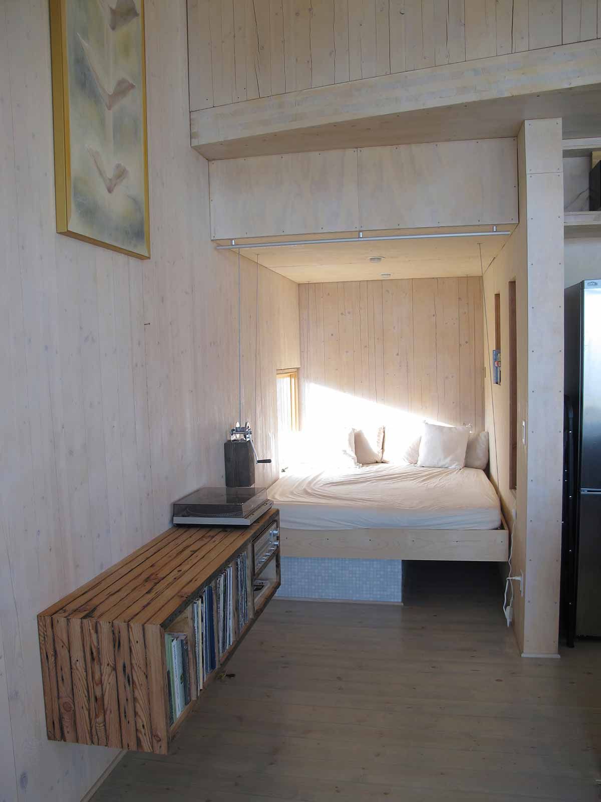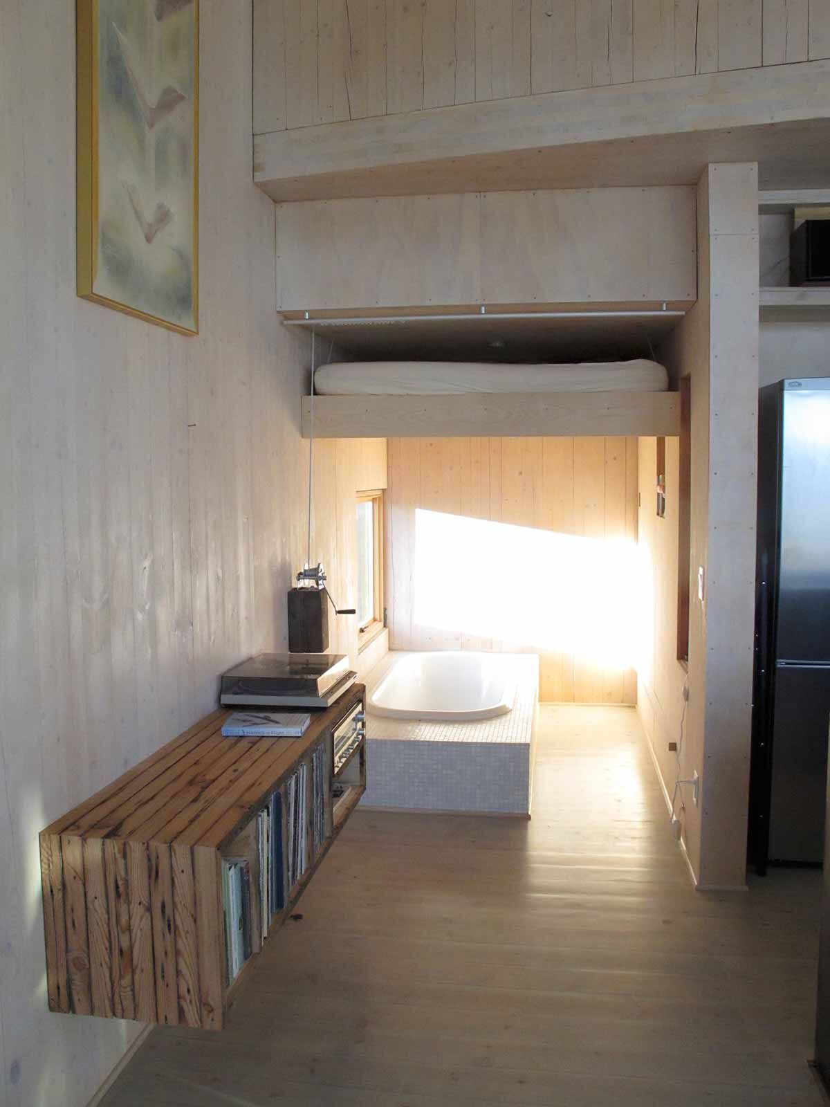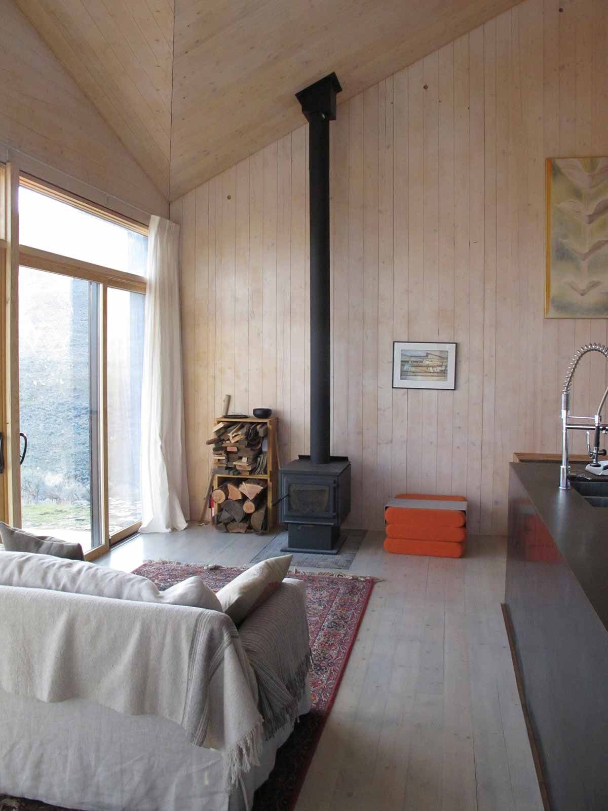 Dubbed Sky House, the sun-filled home is a modest 820-square-feet over two storeys. Since it’s located several kilometres from any services, the couple use solar power for the electrical system, propane for water heating and cooking, and a wood stove to heat the home during the colder months. The remote location also meant that the timber-and-steel house was largely built off-site. The structure arrived on a single tractor trailer and was erected in just two and a half days with a small crew. The rest of the finishing details—like the large kitchen island or the platform bed that raises to the ceiling to reveal a bathtub—took another three months to complete. Now, the couple have a stunning home that’s perfect for relaxing and unwinding.