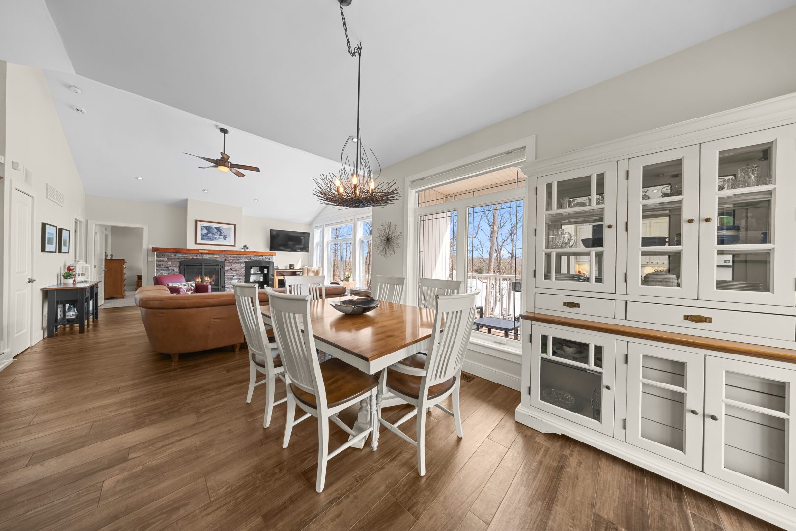- Striking interior design — Elevated living spaces with vaulted ceilings up to 12 feet, expansive south-facing windows, and a bright open-concept layout create a warm, airy atmosphere anchored by a statement stone fireplace and uninterrupted lake views