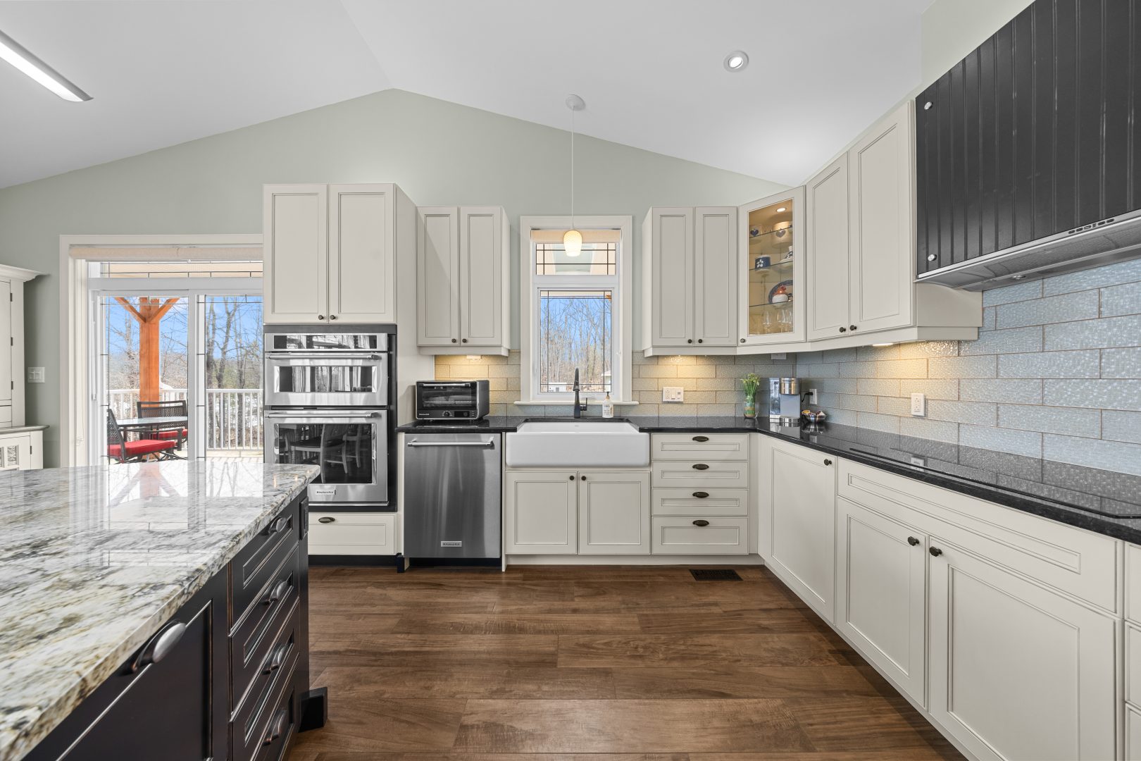 With over 3,200 square feet of thoughtfully designed living space, this four-bedroom walkout bungalow is equally suited to quiet escapes and unforgettable gatherings. The great room is the heart of the home, anchored by a striking stone fireplace and framed by sweeping views of the water and wildlife beyond. The bright chef’s kitchen features a 10-foot granite island, farmhouse sink, premium KitchenAid appliances, and effortless flow into the dining and living spaces.