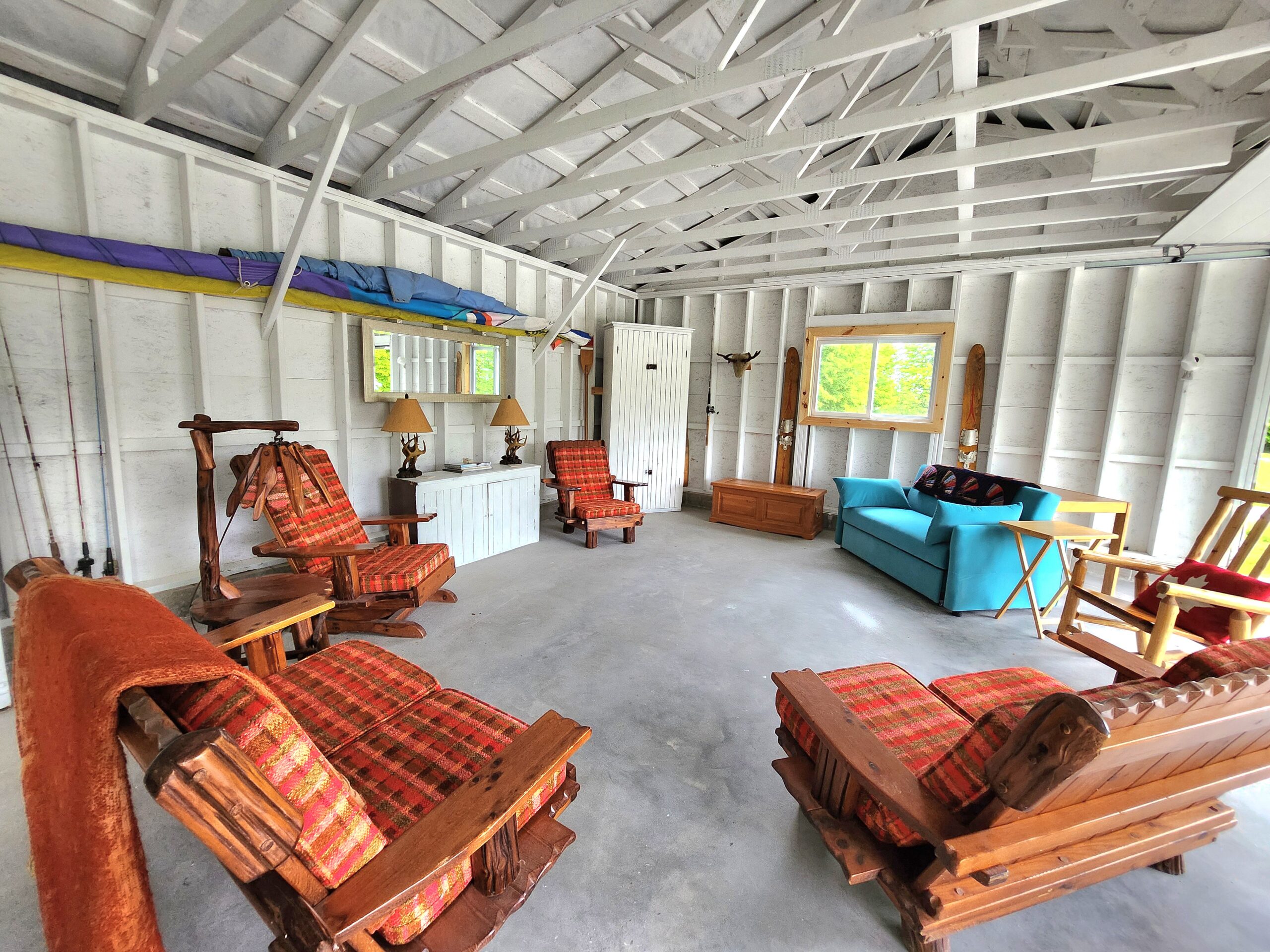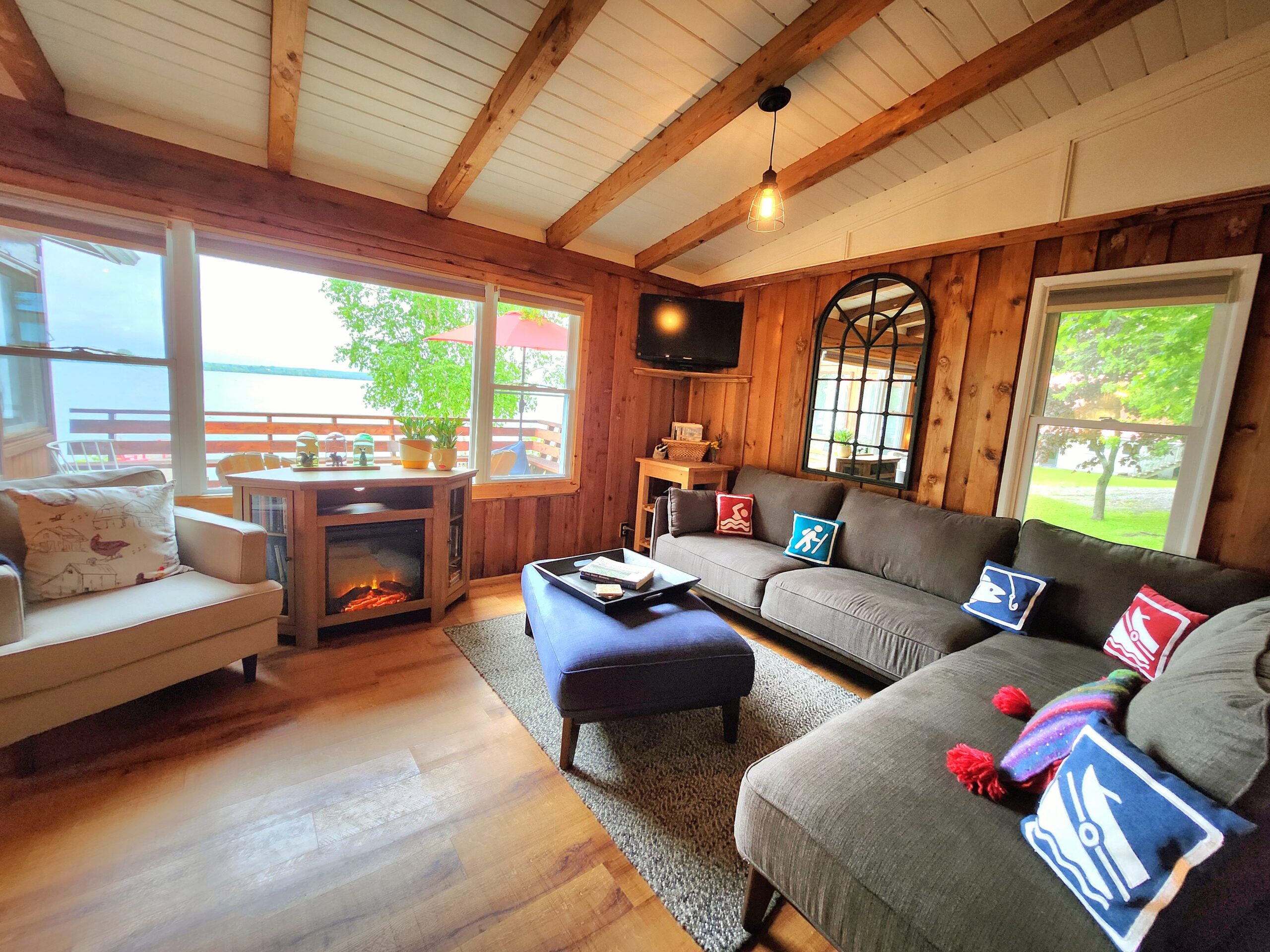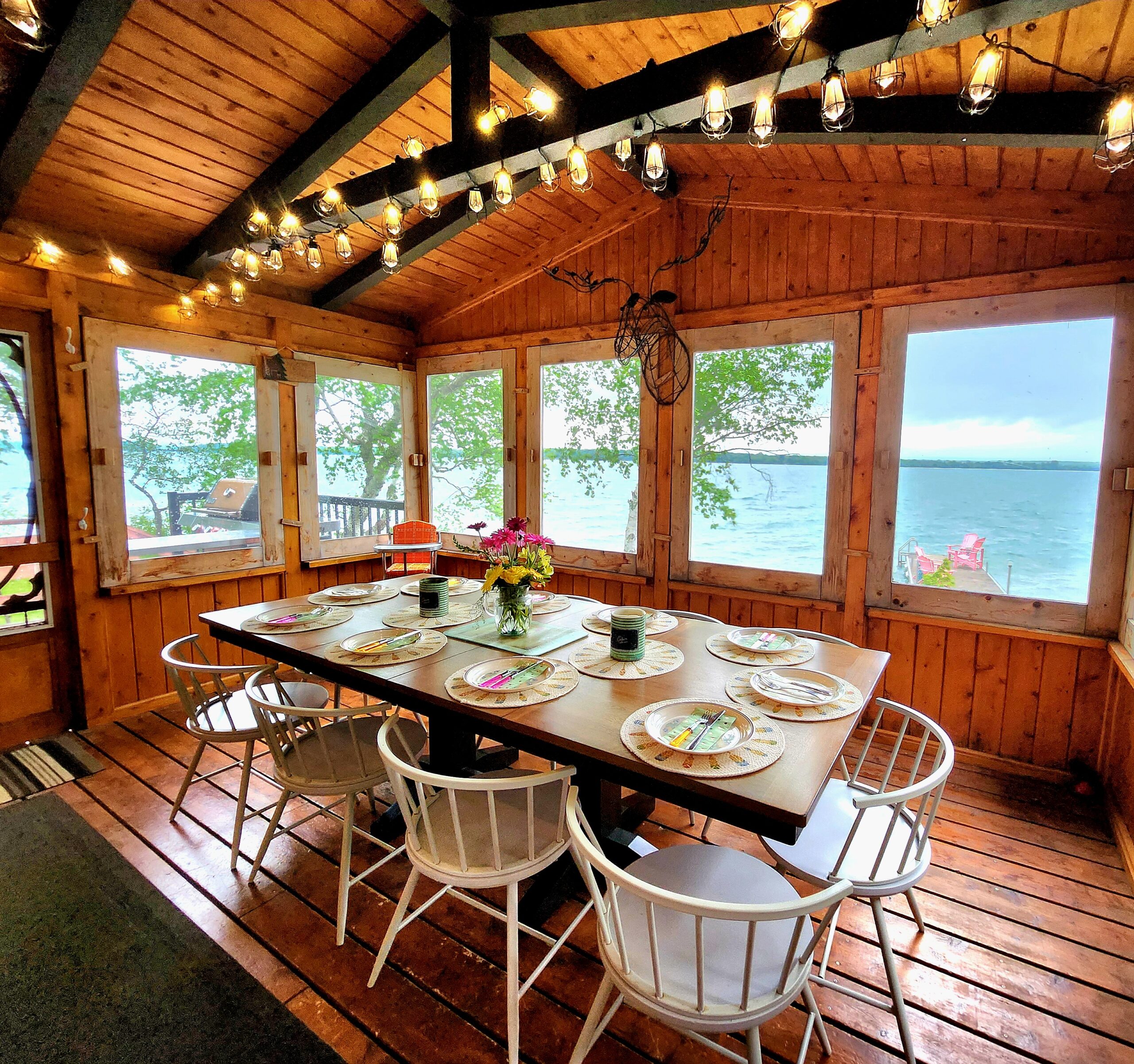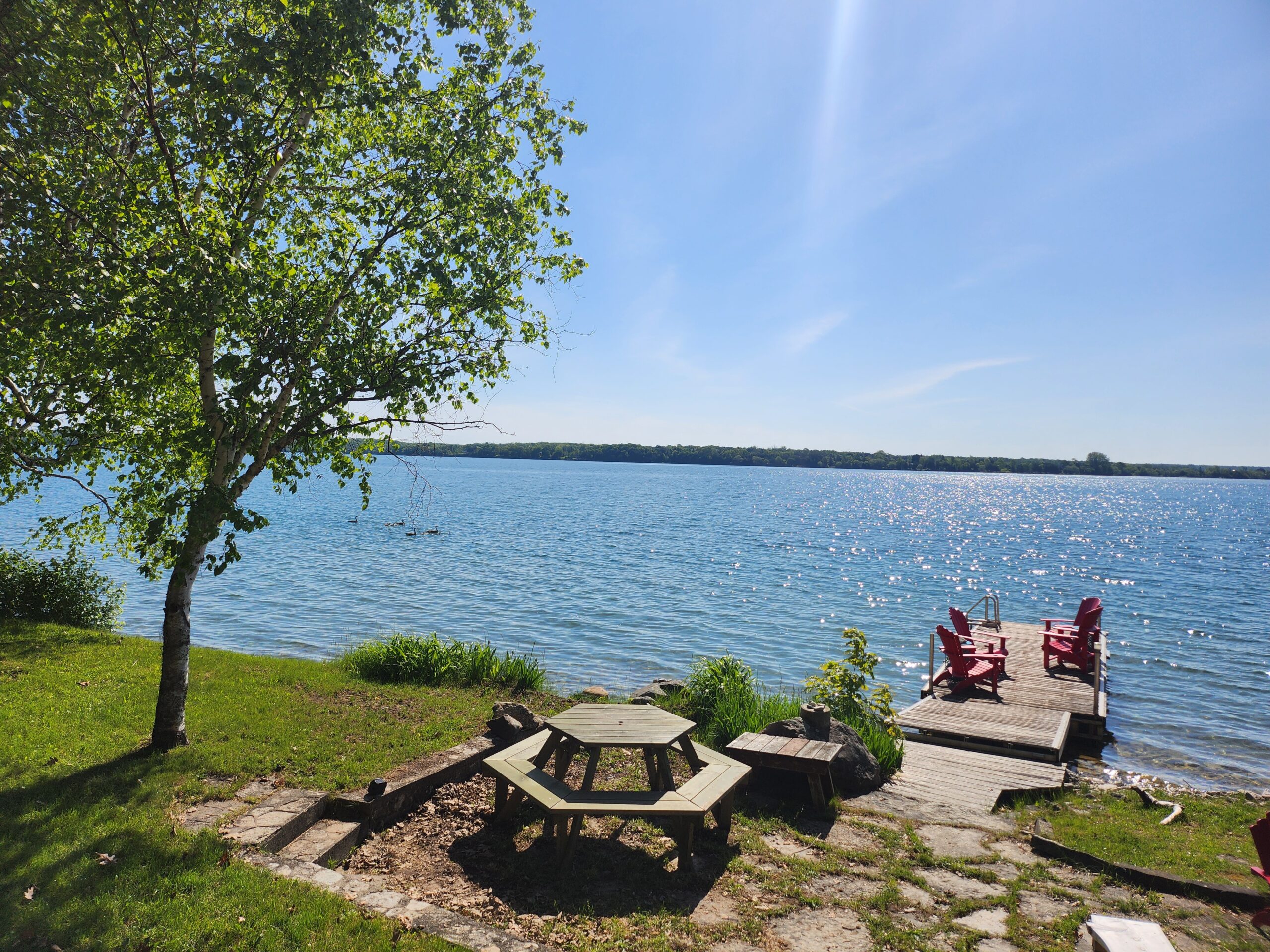 Ultimate waterfront family compound. Sleeps 16! Camp Mindy Meadows is comprised of six buildings. The main three-bedroom cottage has: a full bath tub/shower, living room, kitchen, laundry, screened-in porch with dining that seats up to 12, a two-car garage that is set up as a recreation hall with a ping pong table, a lounge, and a card table. The property also has two bunkies that each sleep two people, one dry boathouse with a guest cottage above that sleeps eight with a kitchenette, a waterfront deck, and a full bathroom with a shower, plus one adorable outhouse. Lush, green rolling lawns with maple, willow, and apple trees. East views with morning sunrises by the water. Municipal road access. This property has been renovated top to bottom and offers exceptional privacy and tranquility.