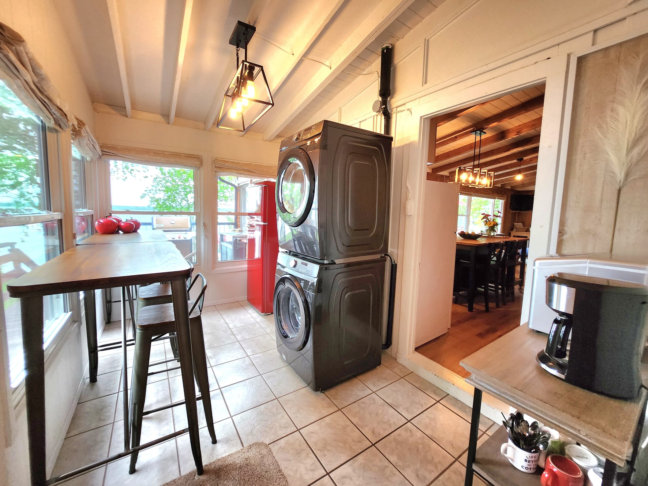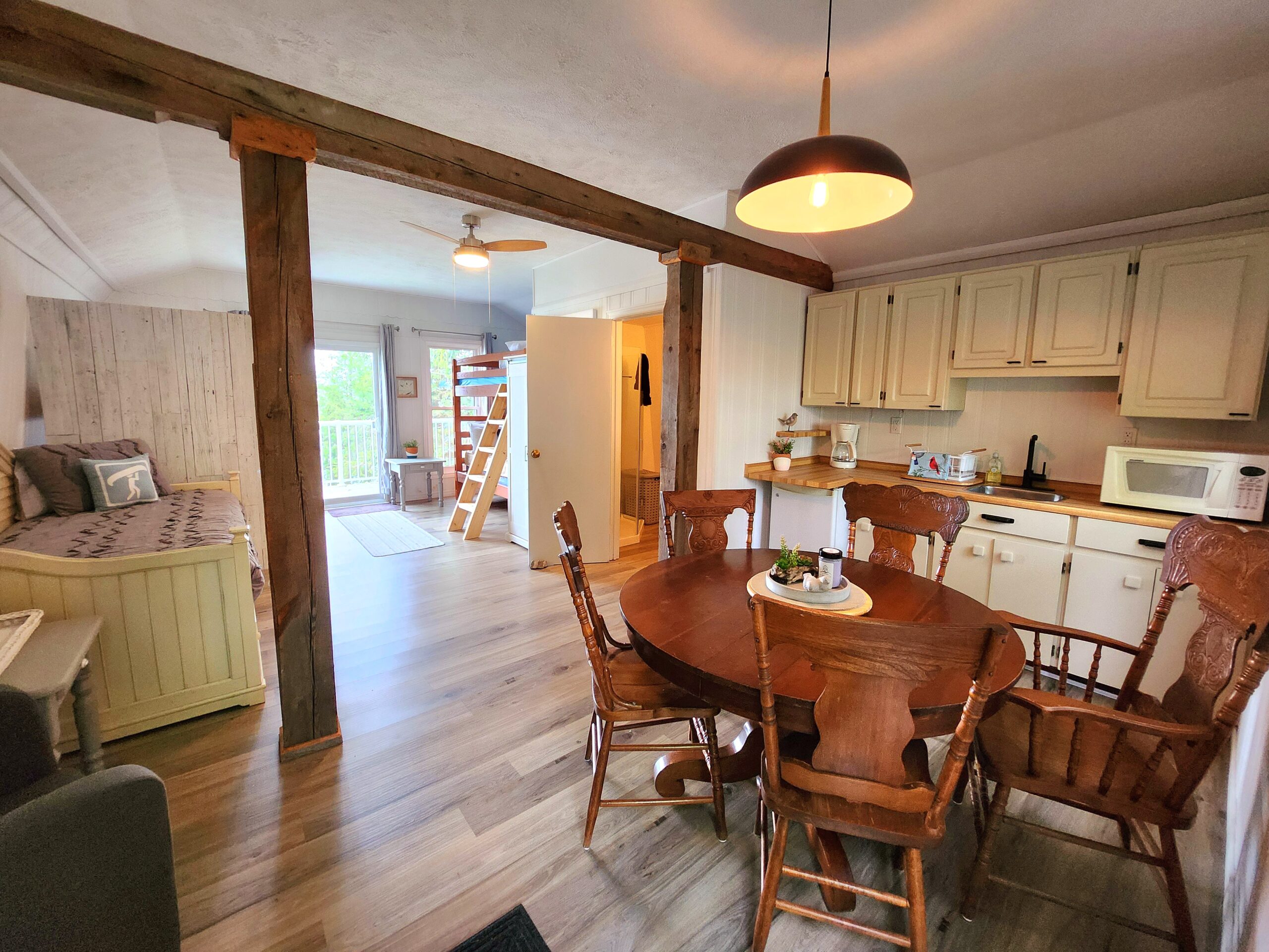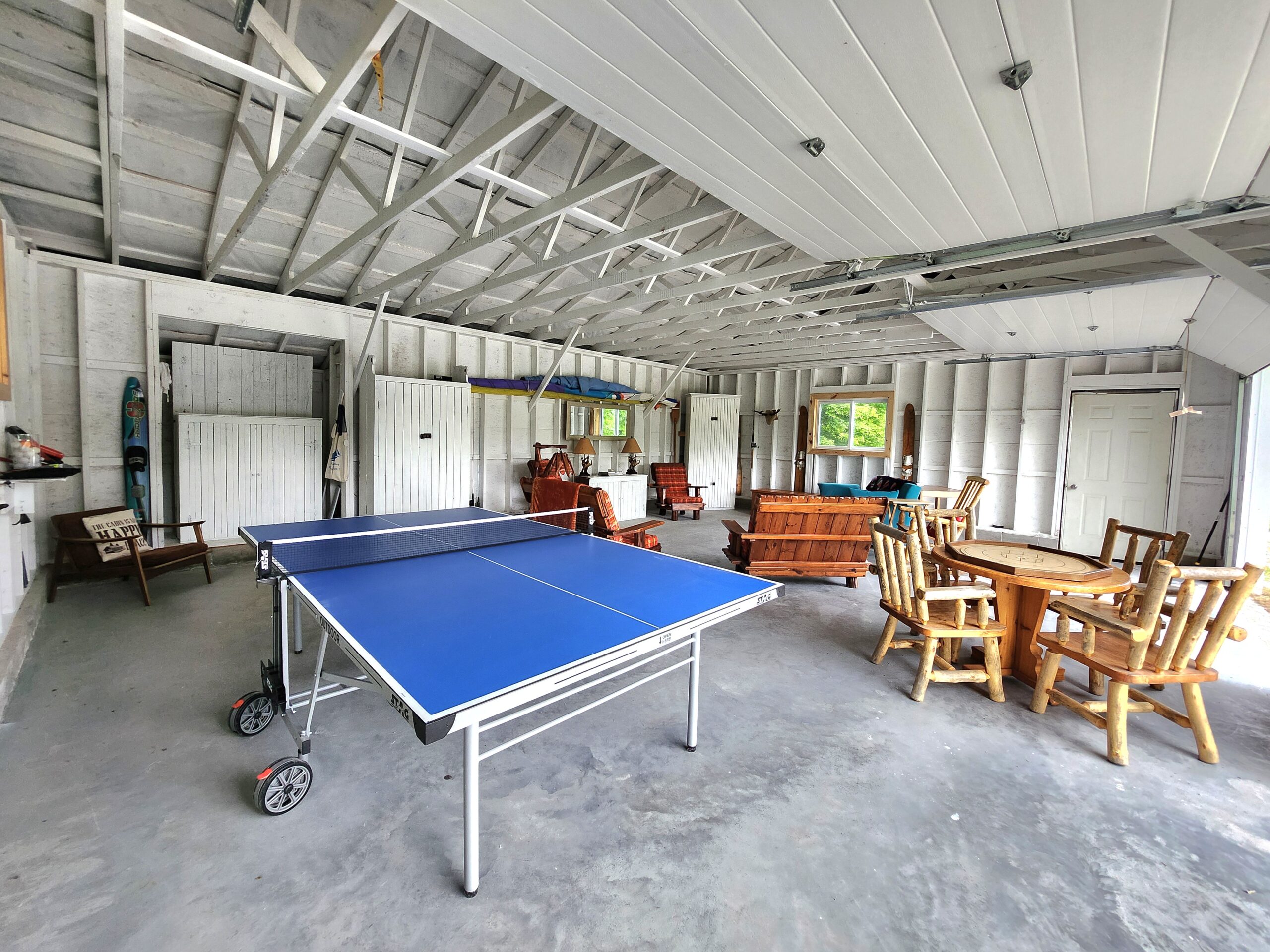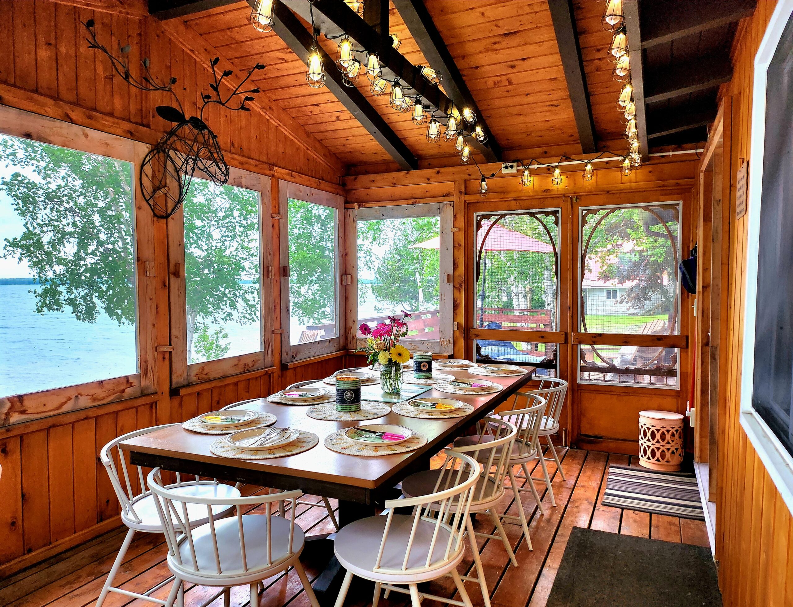Ultimate waterfront family compound. Sleeps 16! Camp Mindy Meadows is comprised of six buildings. The main three-bedroom cottage has: a full bath tub/shower, living room, kitchen, laundry, screened-in porch with dining that seats up to 12, a two-car garage that is set up as a recreation hall with a ping pong table, a lounge, and a card table. The property also has two bunkies that each sleep two people, one dry boathouse with a guest cottage above that sleeps eight with a kitchenette, a waterfront deck, and a full bathroom with a shower, plus one adorable outhouse. Lush, green rolling lawns with maple, willow, and apple trees. East views with morning sunrises by the water. Municipal road access. This property has been renovated top to bottom and offers exceptional privacy and tranquility.