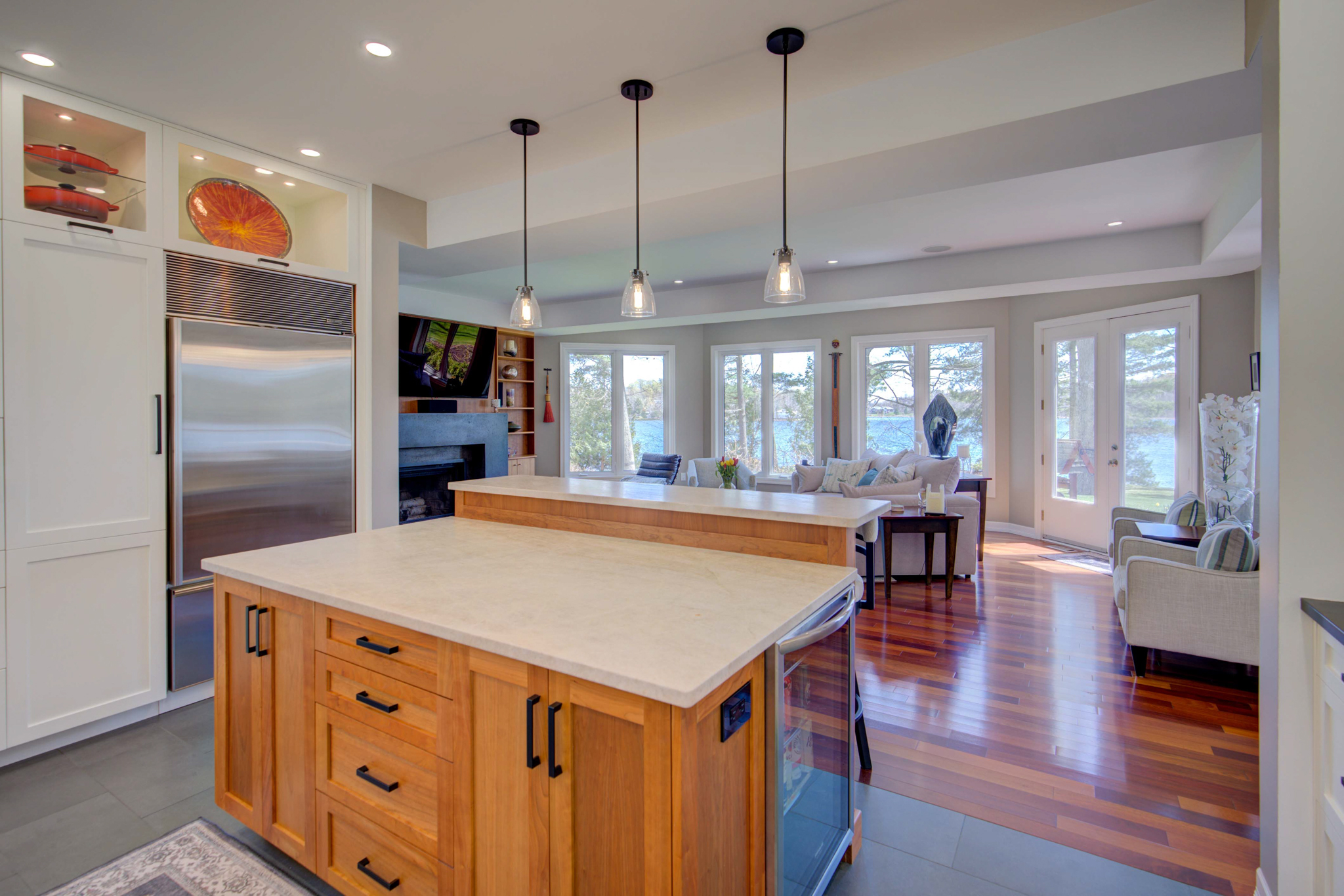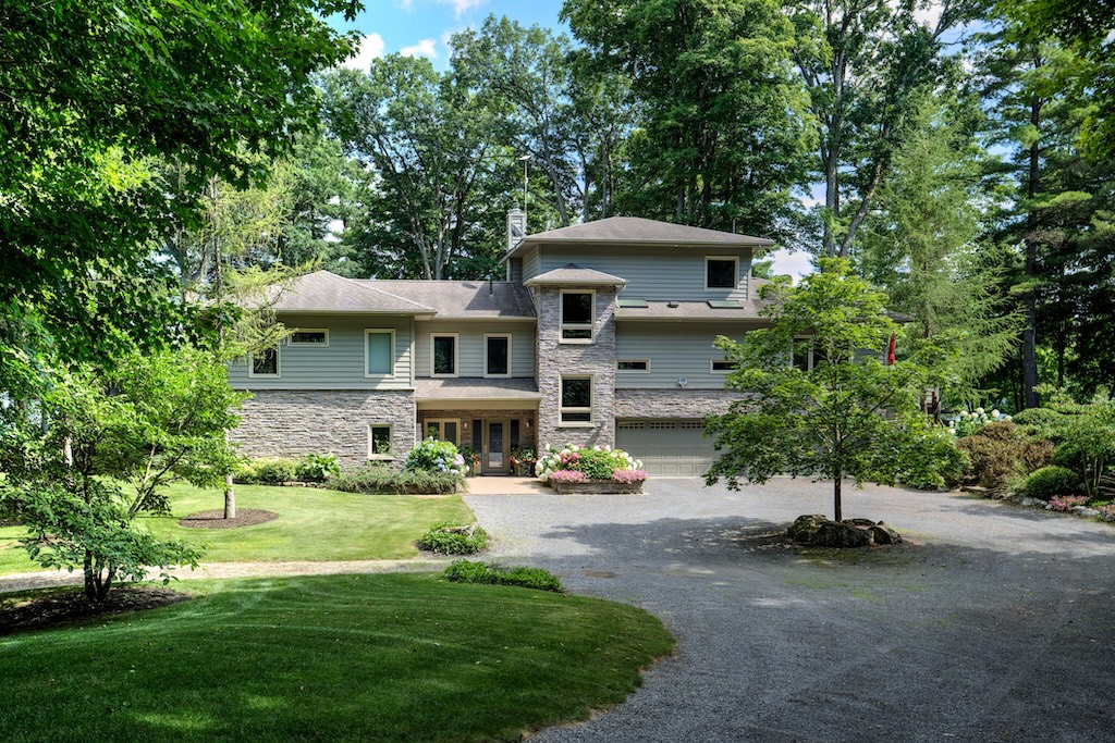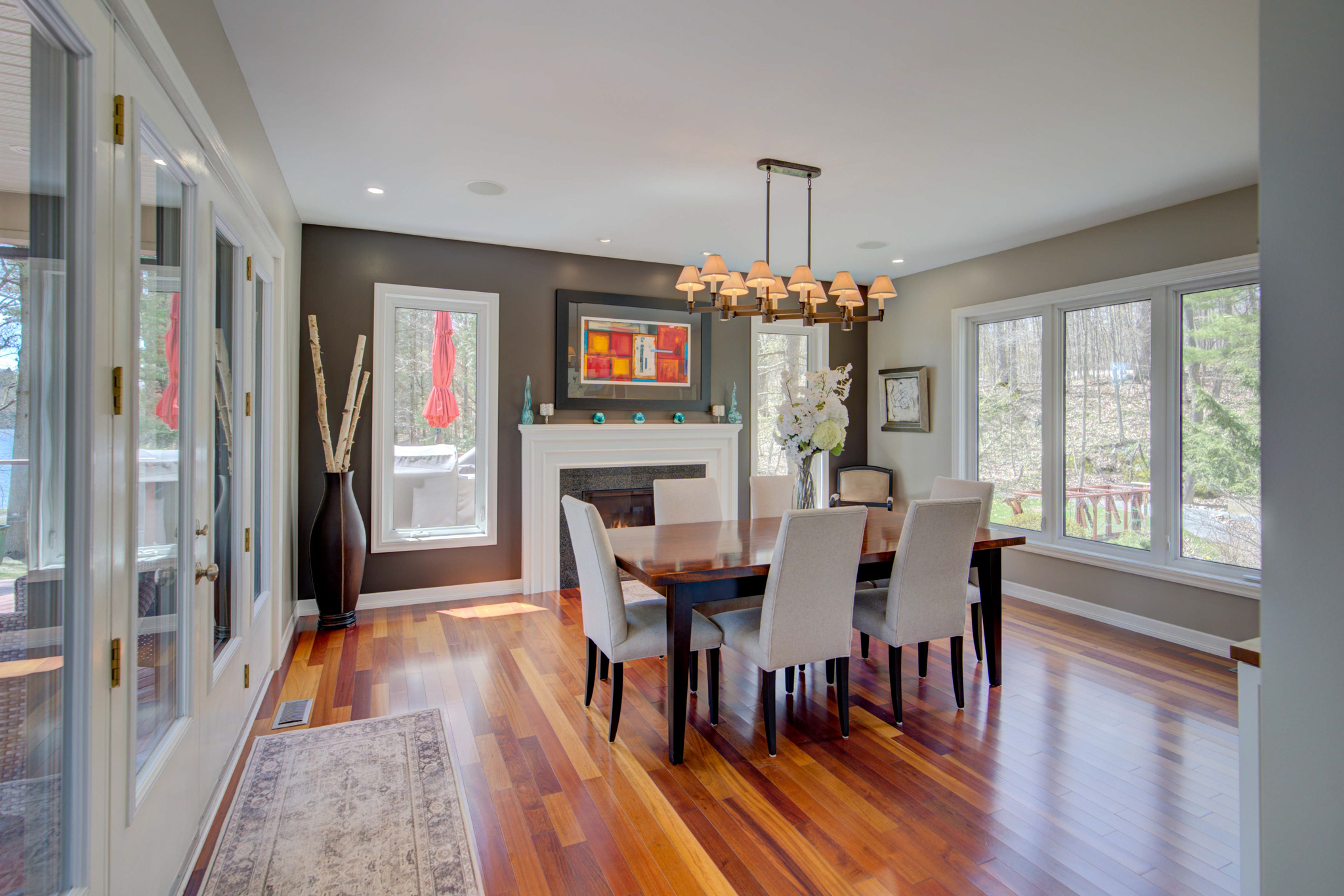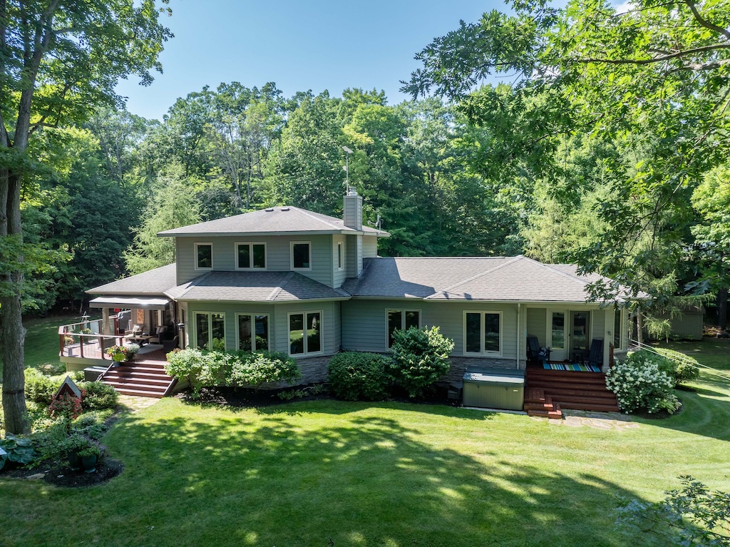 Inside is a four-bed, three-and-a-half-bath, open-concept floor plan with Brazilian cherry hardwood, porcelain, and natural stone throughout. The renovated chef’s kitchen comes complete with granite countertops and high-end appliances. There are two primary bedrooms, each with large ensuites and walk-in closets. A propane boiler provides radiant in-floor heat on the entrance level, including two garages, with an efficient forced air system supplying heat to the rest of the house, which also features a wood fireplace in the living room and a propane fireplace in the dining room.