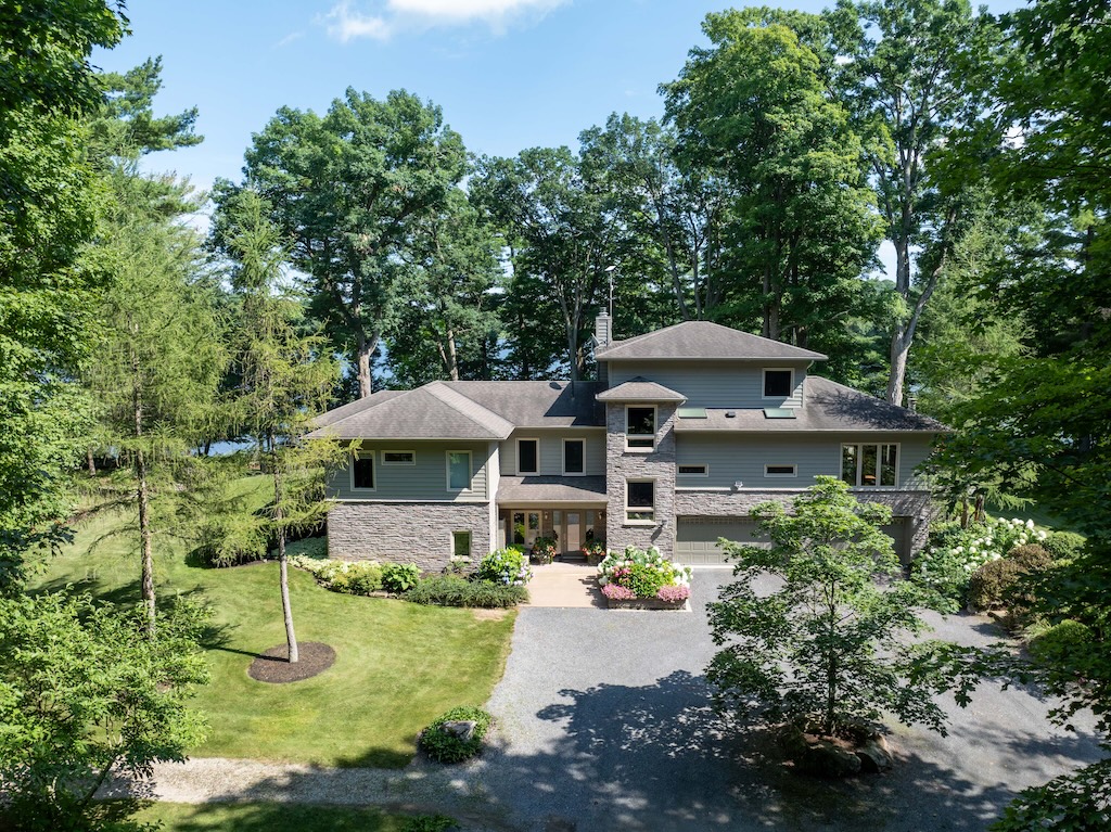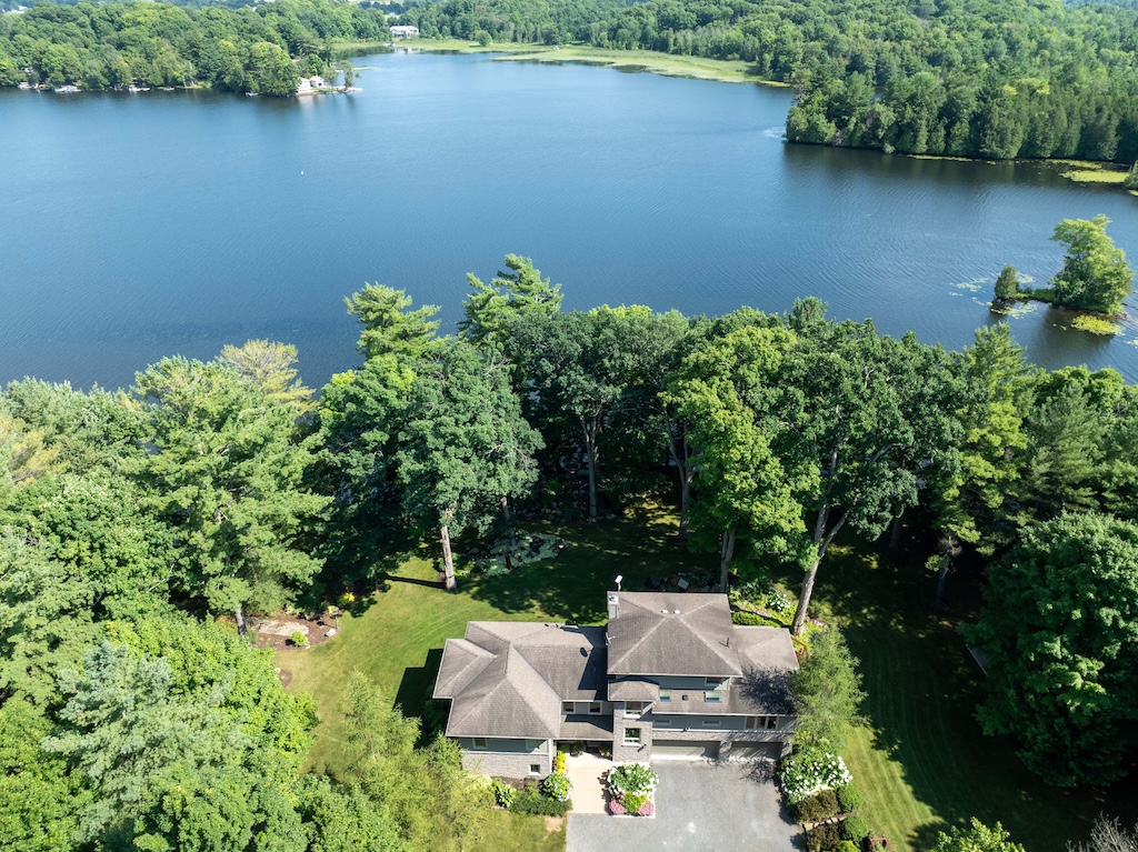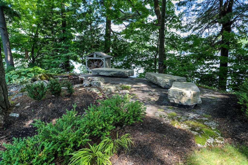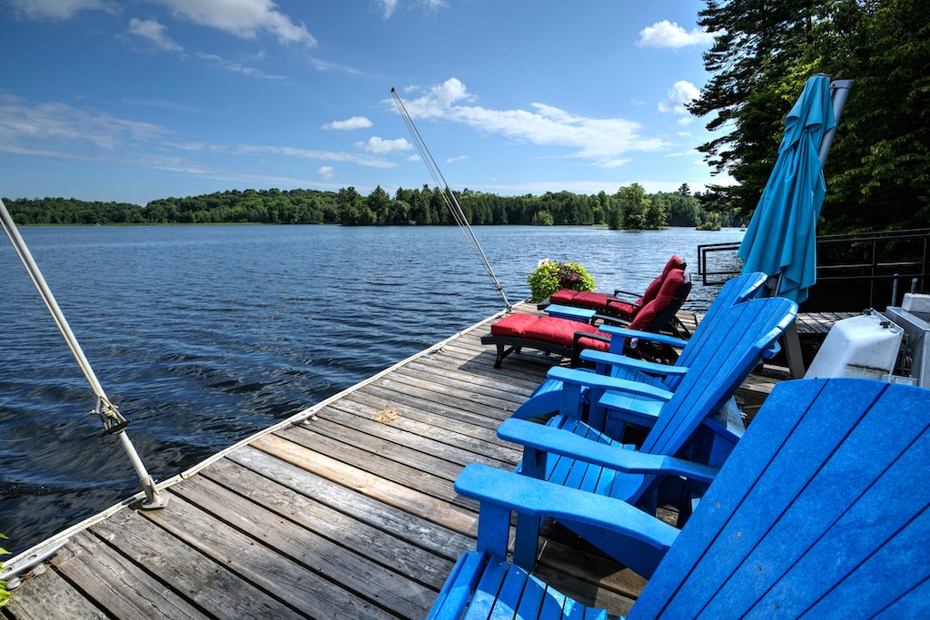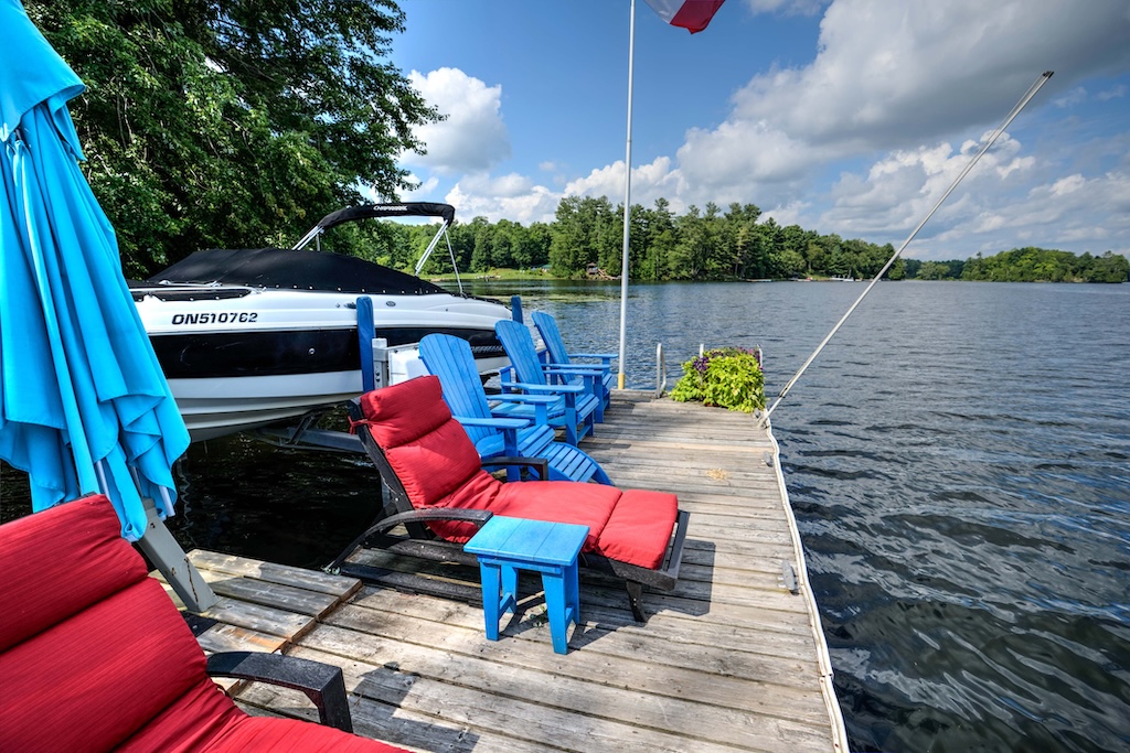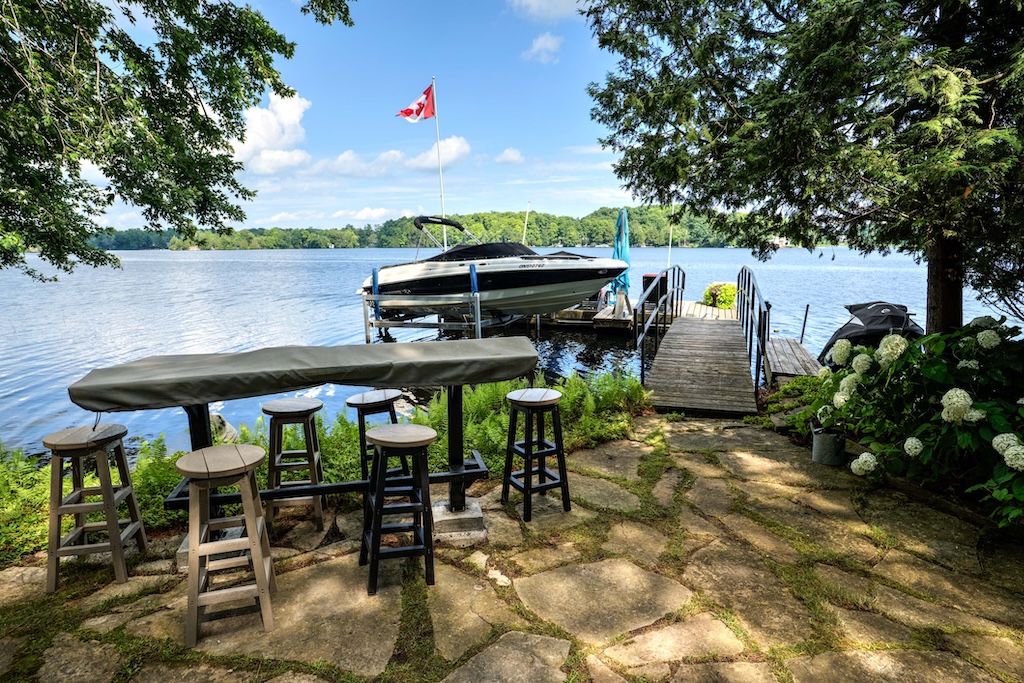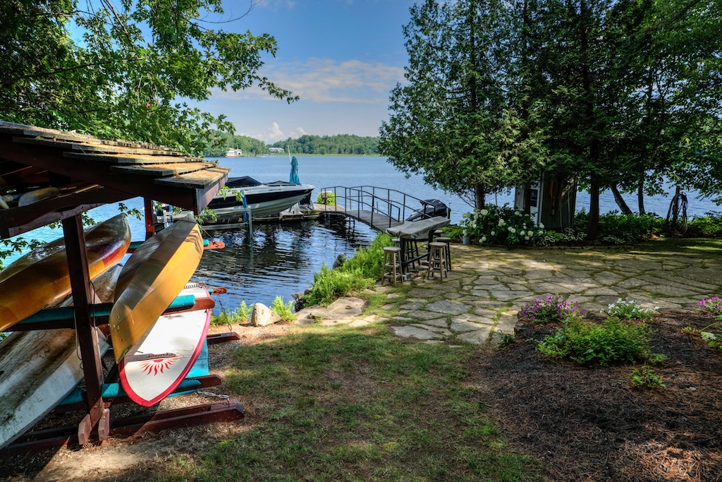 The property’s 1,330 feet of private waterfront on a point provide a 210-degree view of the Rideau Canal, stretching from Kingston, Ont., to Ottawa, Ont. A large flagstone patio at the base of the dock provides access to a sandy bottom, ideal for small children and pets. Or jump into seven-foot-deep clean water off the dock.