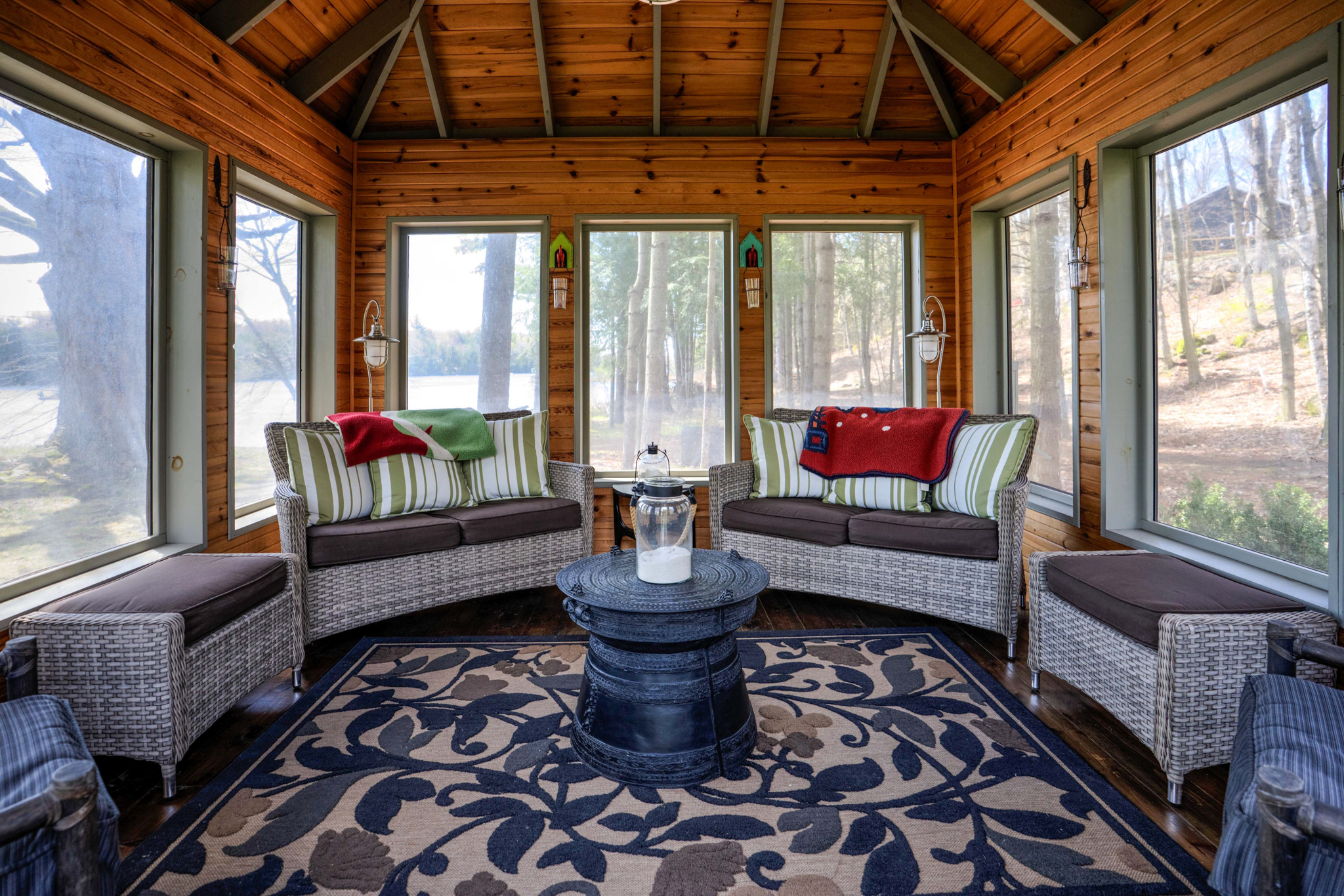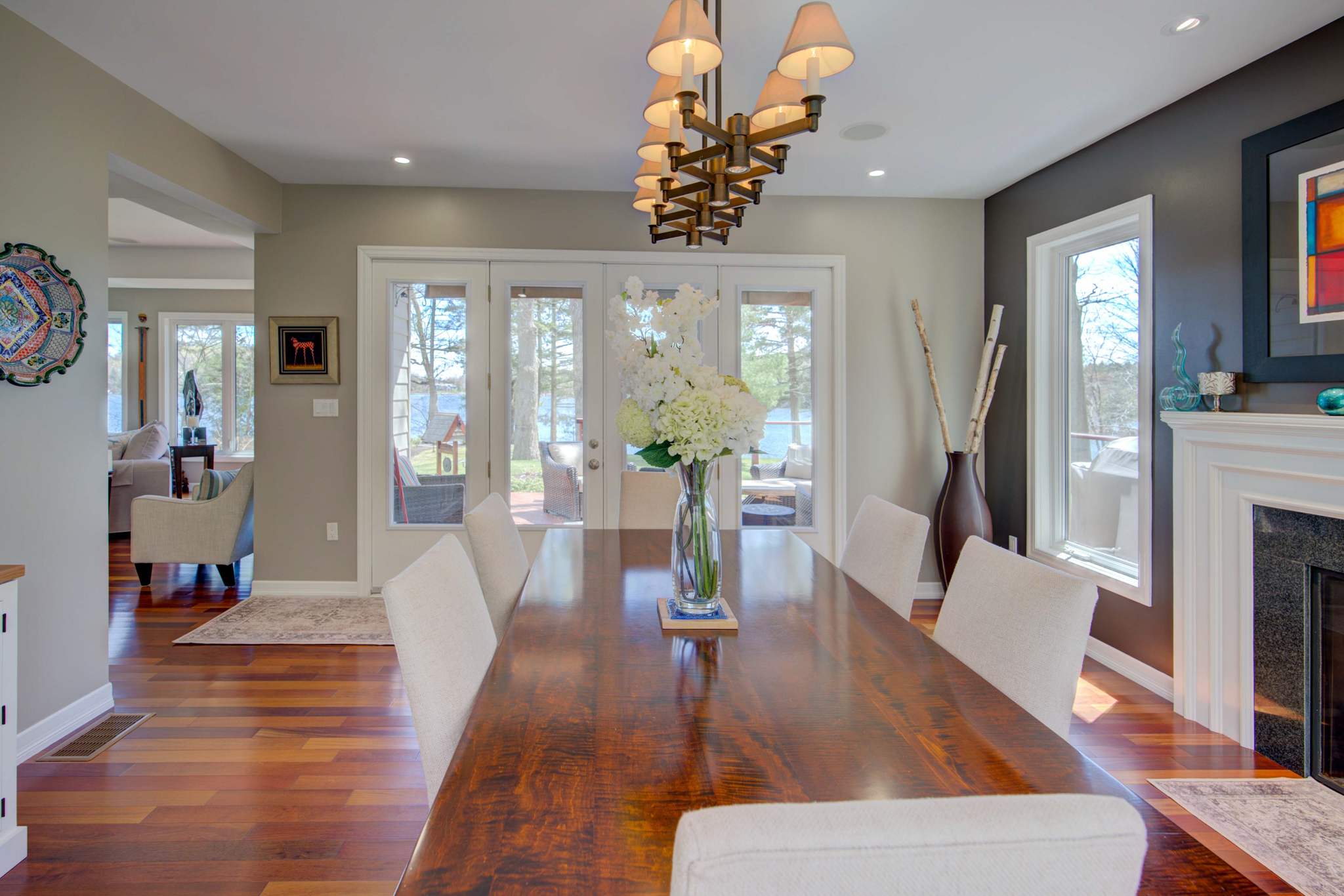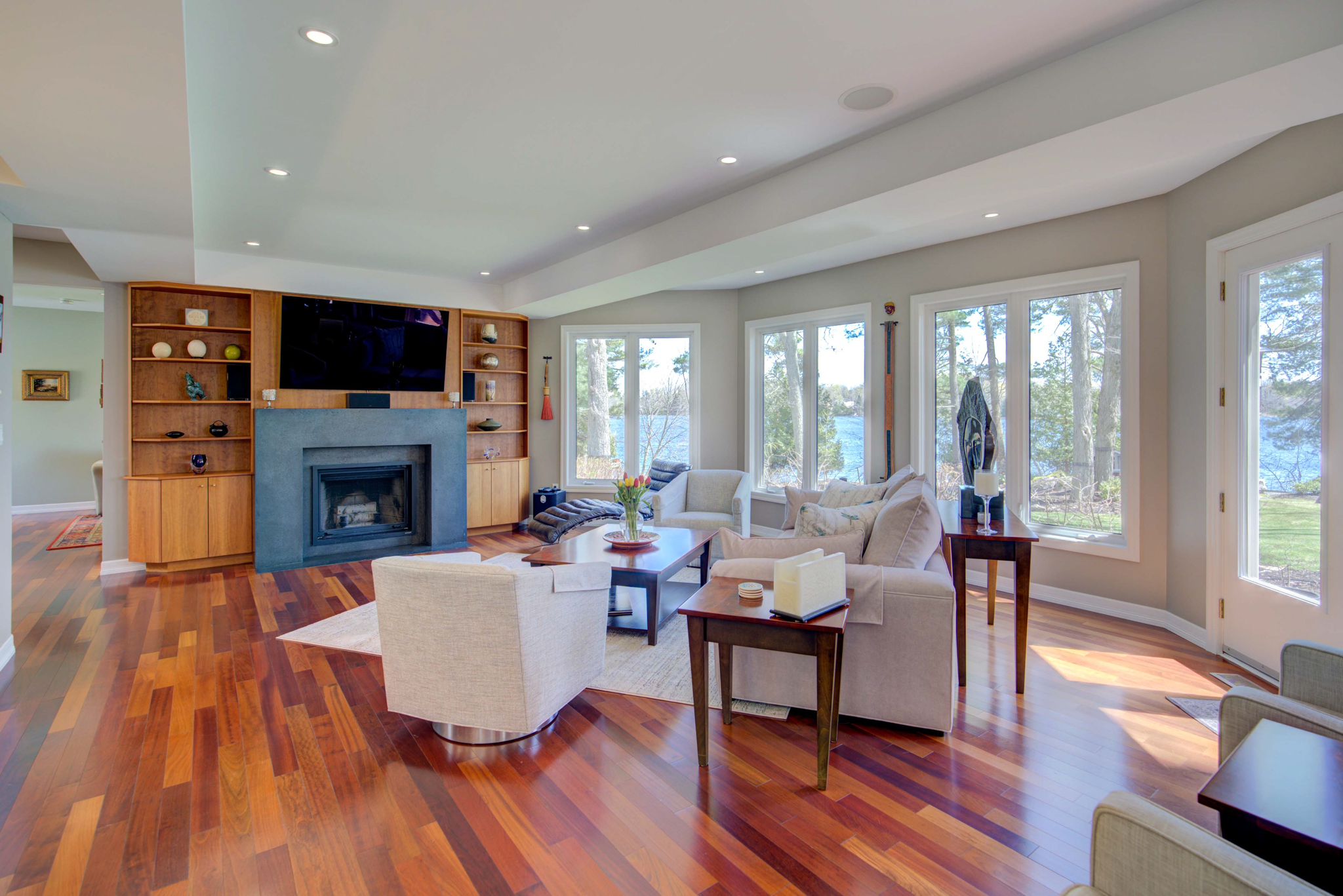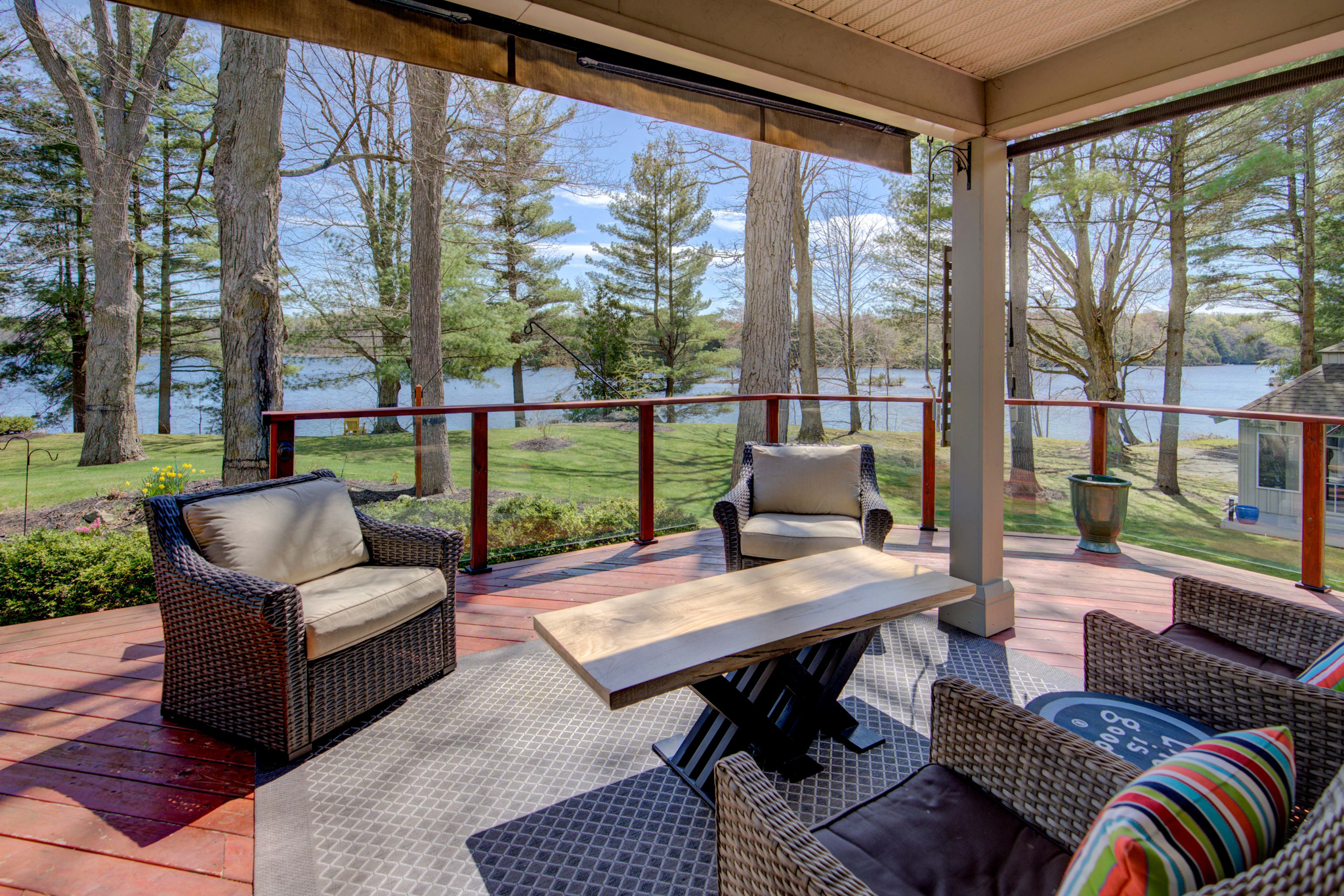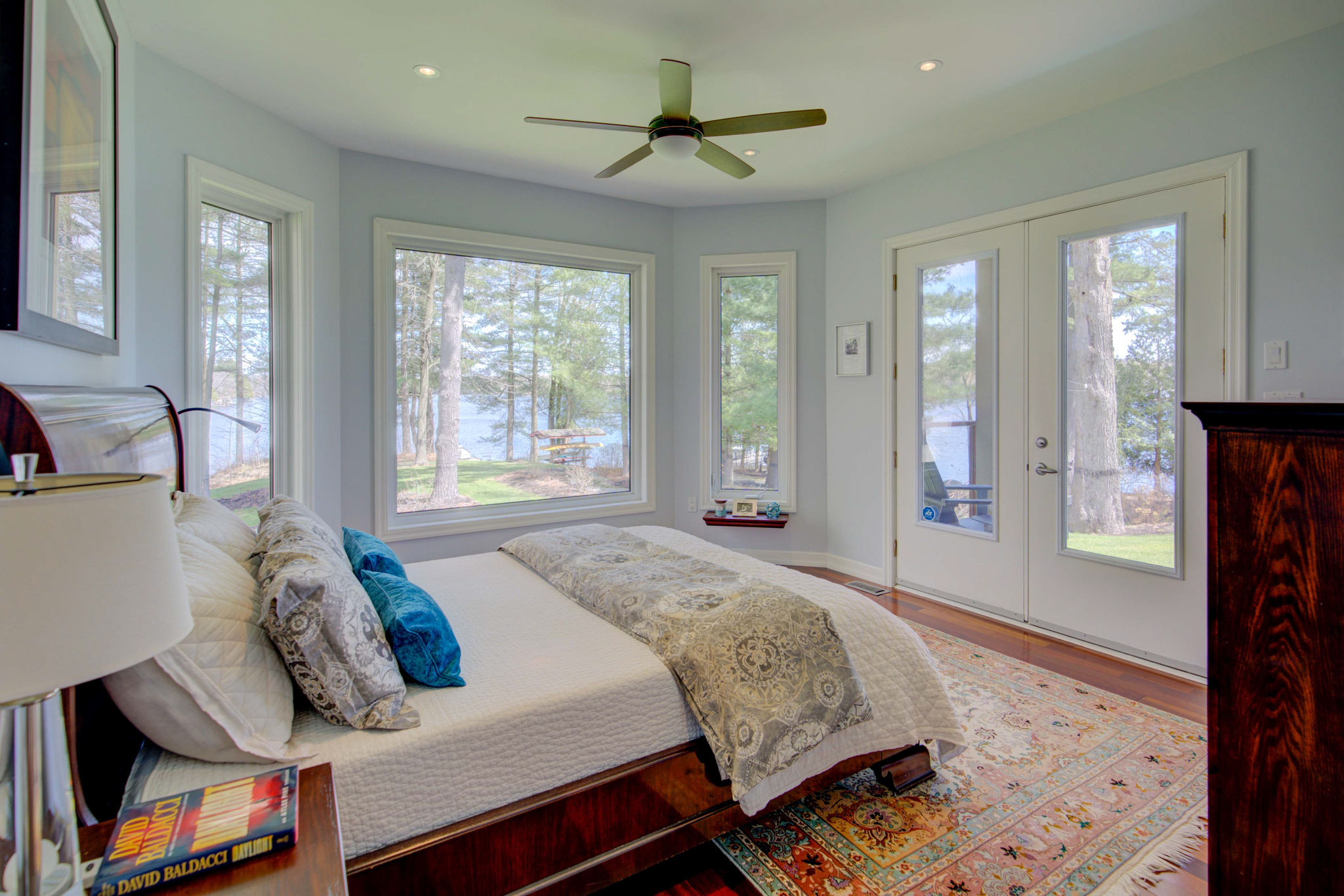 The property’s 1,330 feet of private waterfront on a point provide a 210-degree view of the Rideau Canal, stretching from Kingston, Ont., to Ottawa, Ont. A large flagstone patio at the base of the dock provides access to a sandy bottom, ideal for small children and pets. Or jump into seven-foot-deep clean water off the dock.