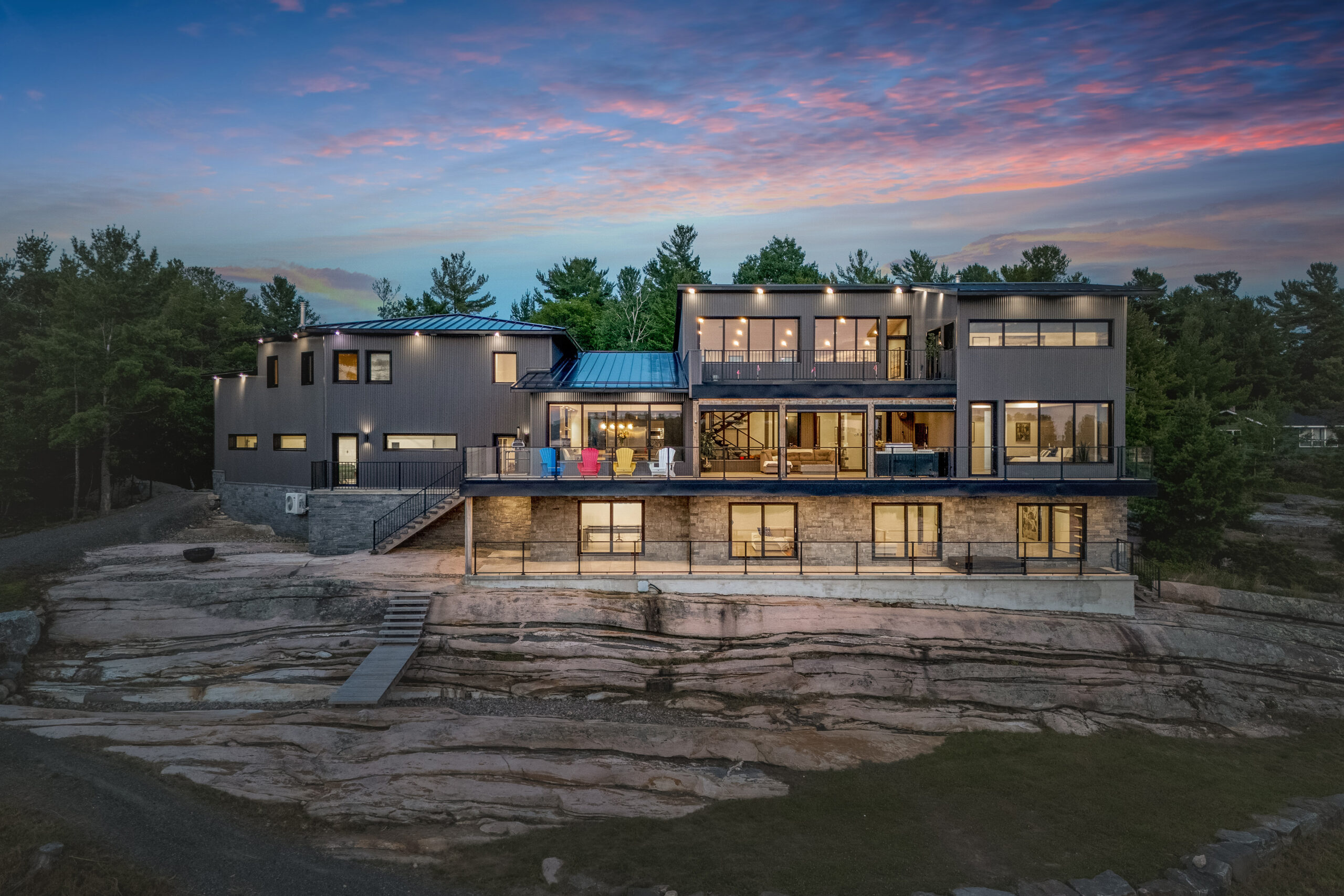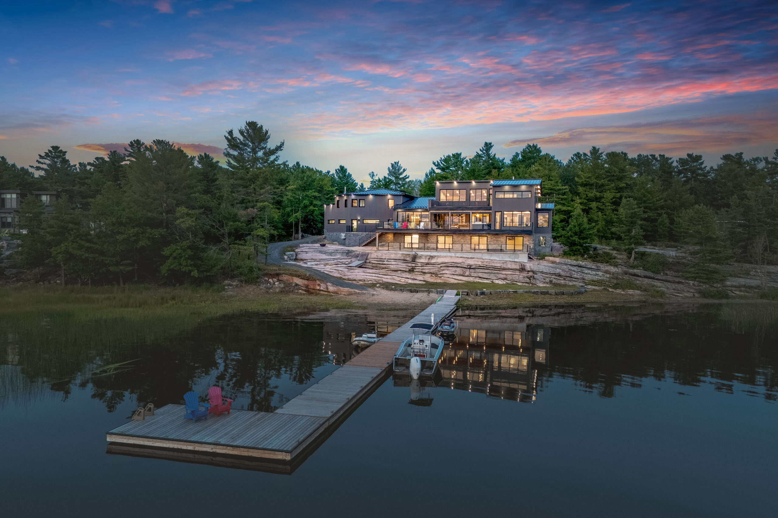 Set amid the breathtaking beauty of Georgian Bay, this remarkable estate spans 1.75 acres of pristine landscape, offering 233 feet of private shoreline with unparalleled western sunsets that captivate the senses each evening. With nearly 7,500 square feet of meticulously crafted contemporary living space, this sprawling home features four bedrooms and a self-contained 1,000-square-foot, one-bedroom apartment, ideal for in-laws, guests, or a live-in nanny. The open-concept design is an entertainer’s paradise, complete with state-of-the-art kitchen facilities, a separate caterer’s kitchen, and a mini-putt green for leisurely enjoyment. Enhancing the property’s charm are folding exterior doors to the grand deck, which seamlessly integrates indoor and outdoor living.