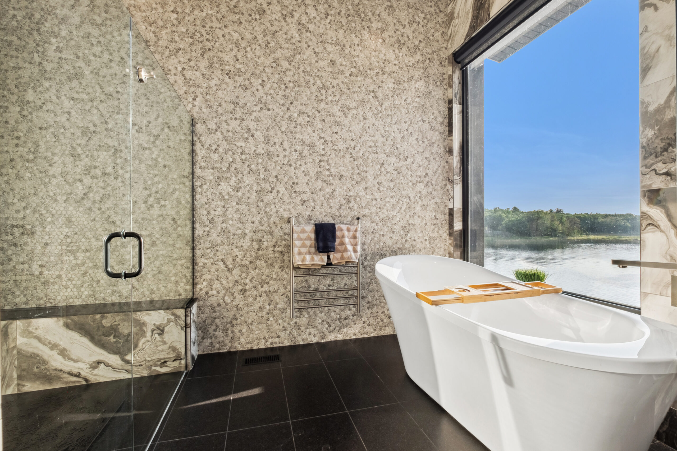 - In-floor heating, high-end appliances, a hot tub, and and steam sauna