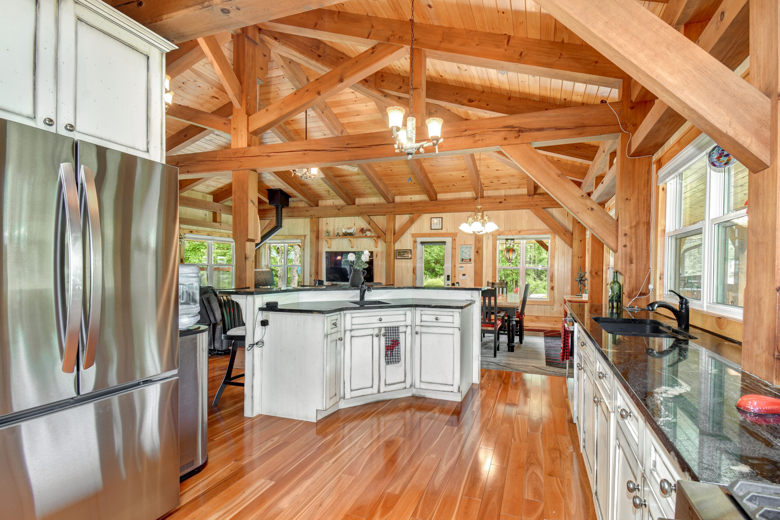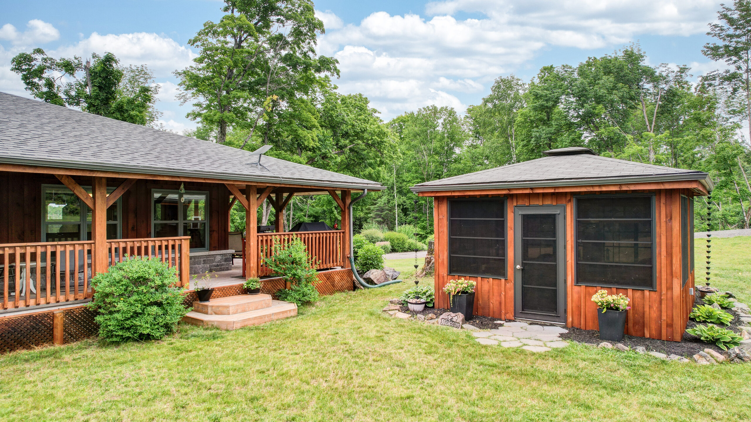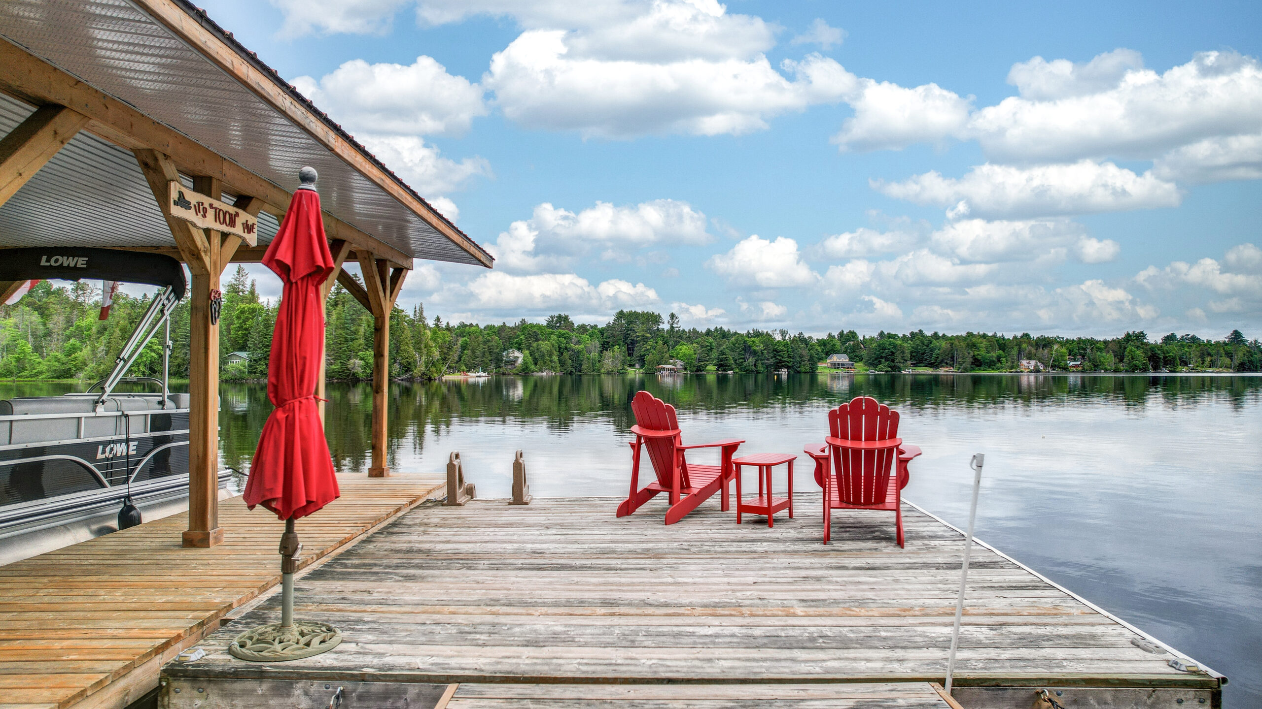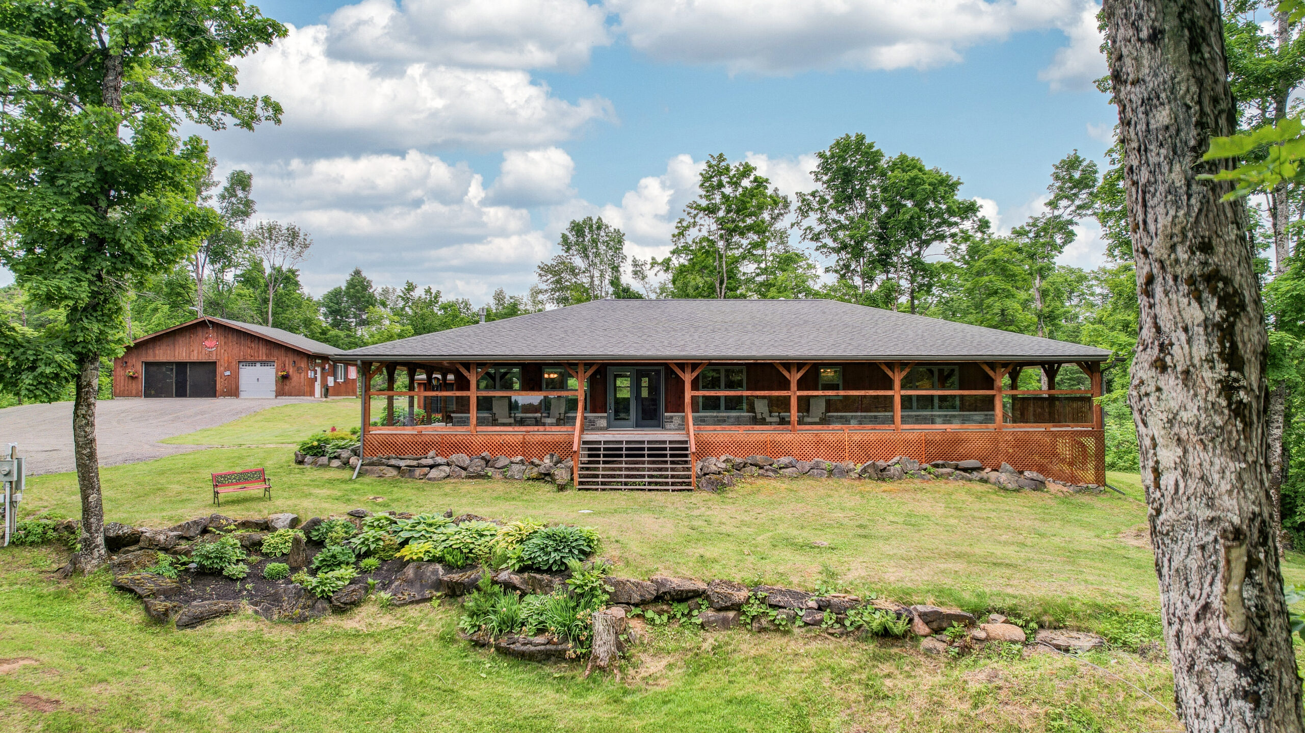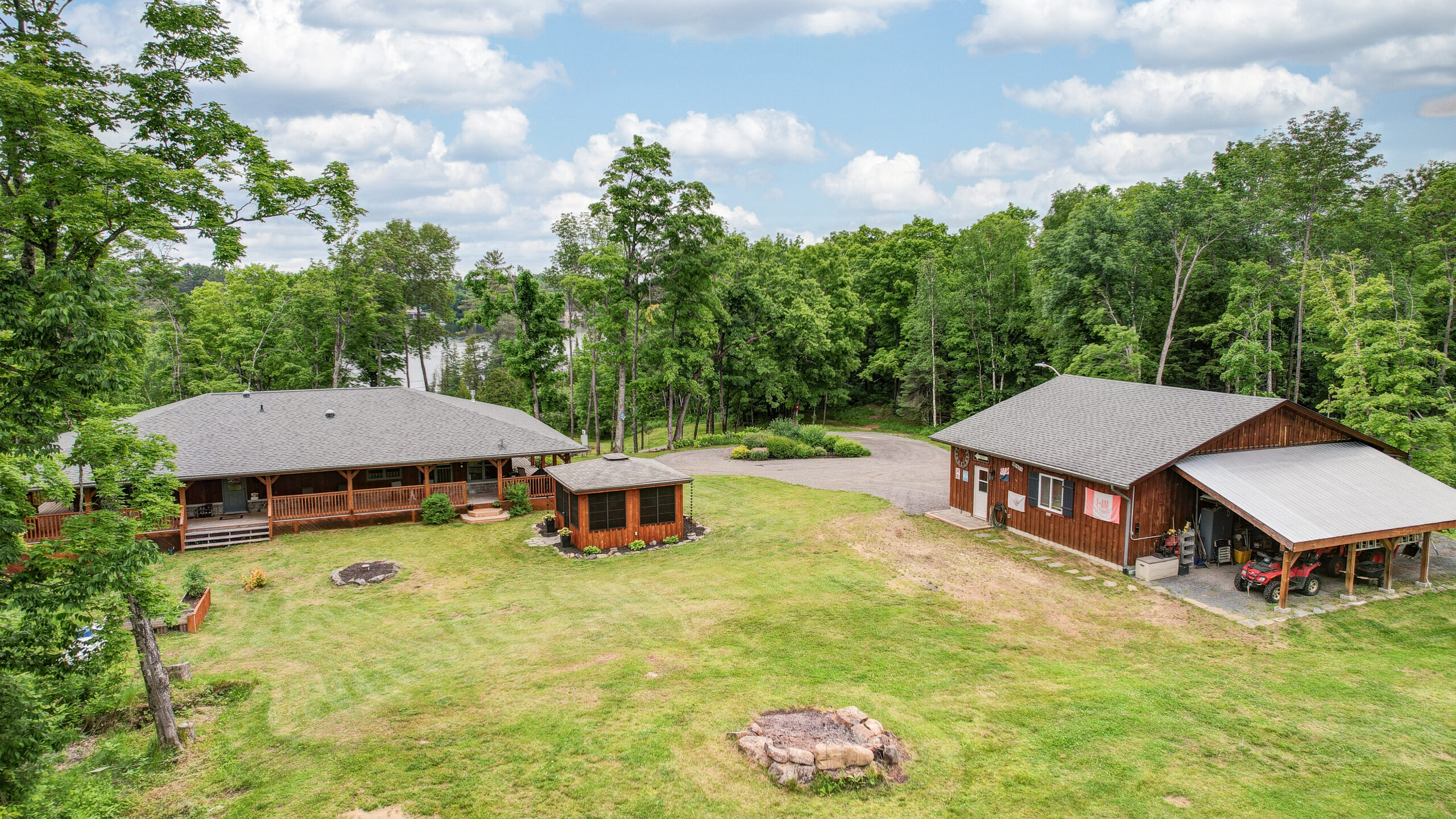 Discover a timber-frame home on Steenburg Lake that’s the complete package and more! Approximately 1,800 square feet of living, with a full wraparound porch overlooking beautiful Steenburg Lake, with a clean waterfront, all sitting on 86 acres of land with trails. The waterfront is across the paved cottage road, with a large dock system and newer floating boat house that’s big enough for 22-foot pontoon boat. There is a 30′ x 40′ heated shop, with a drop-down screen door system and a large covered area for extra storage. Hang out in the screened gazebo or chill on the wrap-around porch. Extra features include an auto generator, central air, high-efficiency furnace, underground sprinklers, an alarm system with cameras, stainless appliances, a small pond with a fountain, and so much more. Recent upgrades include furnace, central air, roof, and eavestroughs. This is a legacy-type property that will be hard to match. Come and take a look, and you won’t want to leave.