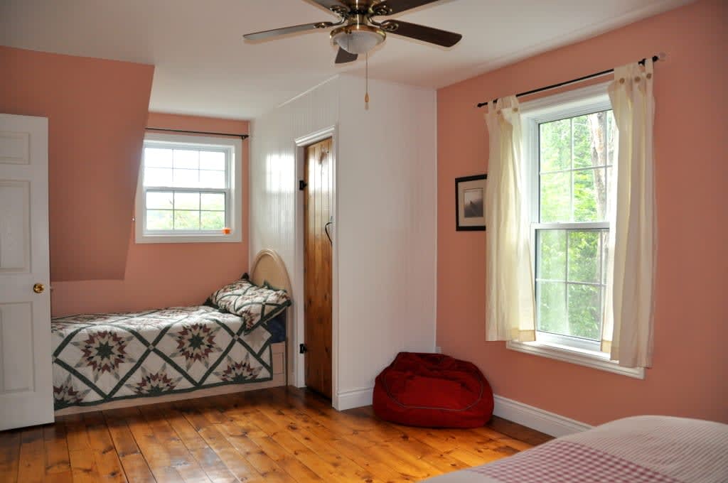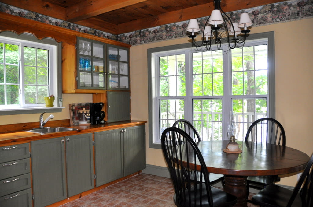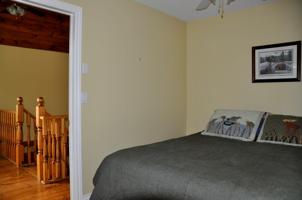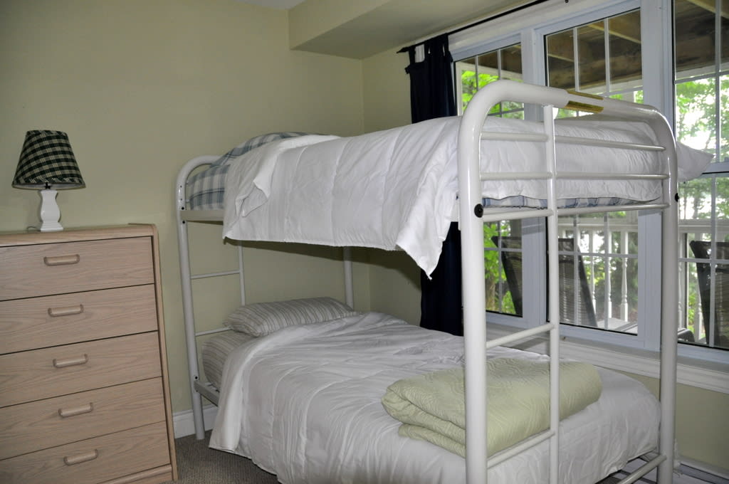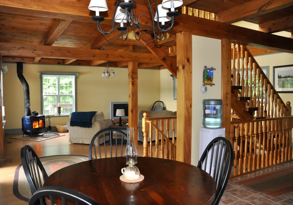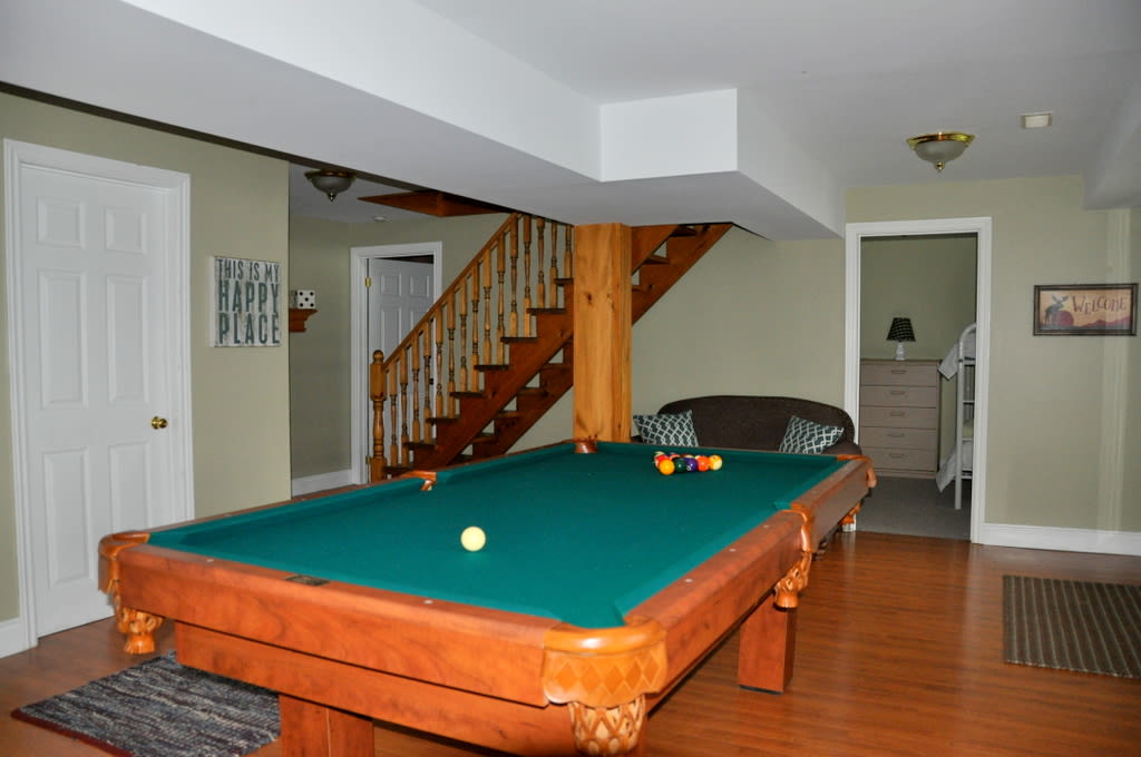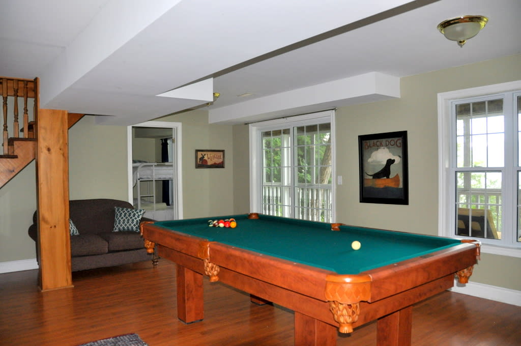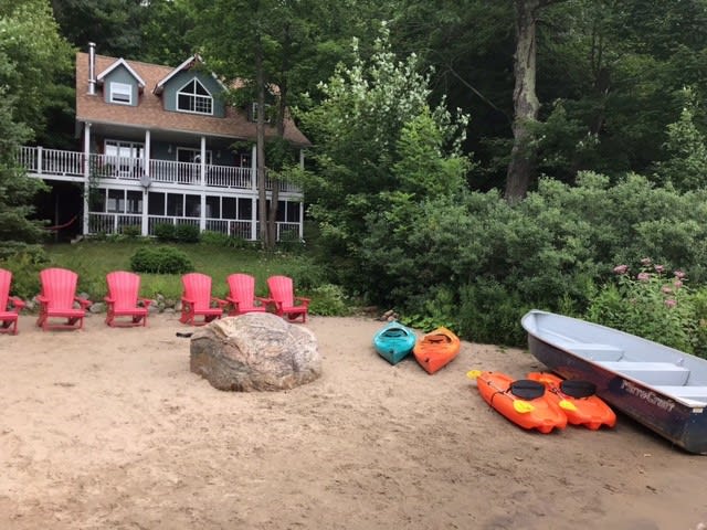 This three-bedroom, two-bathroom cottage on tranquil Echo Lake in Muskoka is the quintessential summer getaway. The stylish cottage is a great place to relax, with its rich wood accents and pastel-coloured rooms, lake-facing bedroom windows, and a claw-foot bathtub. Spend quality time with your loved ones around the kitchen table while you enjoy the wood stove and play some board games. With space to accommodate six people, this rental will give you the best of both words: time spent together, and space to yourself. On the lower level, you will find a spacious rec room with a billiard table and a walk-out to the large porch. Kick back on the Muskoka chairs or curl up with a book on a cushioned rocking chair. Hit the lake in the kayaks, or fire up the barbecue for dinner. Bonus: the property includes a hammock!