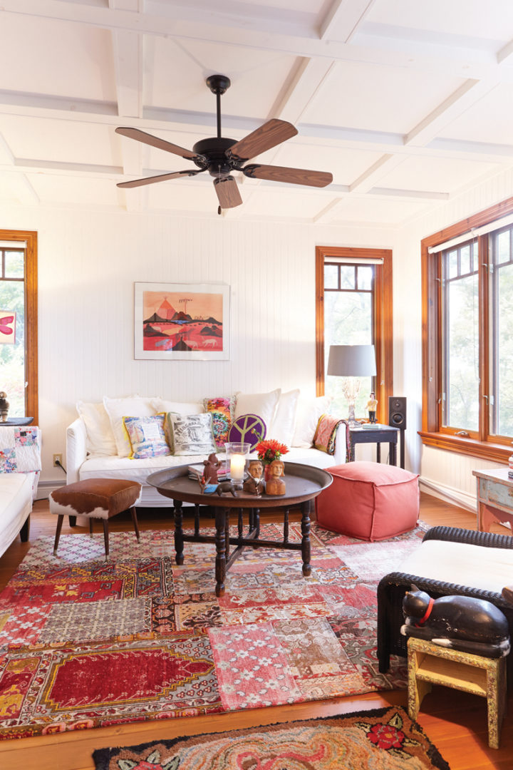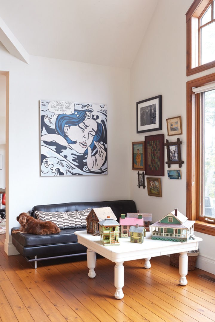 Every object Dyan chooses, however, has to mean something to her. “The way the cottage is decorated—it’s who I am.” Articulate and outgoing, an “oldest clothes at the cottage” kind of girl, Dyan has no trouble explaining her collecting philosophy. The peace-sign pillow and the one patterned with Jerry Garcia bears in the den? “I’m such a hippie.” The vibrant colour of the Inuit drawing hanging above them picks up the hot pink and tangerine of the bear pillow (and the two together also make a subtle connection, she says, between the Inuit and bears). But why that particular piece of art? “It’s done in Laurentien coloured pencils,” she says, “like the ones in my school kit when I was a kid. The artist created his art with something I also used. I always put myself in the picture somewhere.”