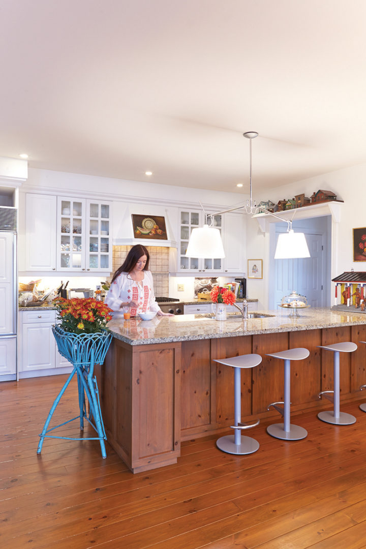 The blue and yellow house from Quebec on the kitchen island certainly has tales to tell. Its long verandah gives it a cottagey feel. And its carved figures wear swimsuits, except for the woman who’s topless and the guy who’s naked and in an obvious state of arousal. “One form of folk art is erotica,” says Dyan.