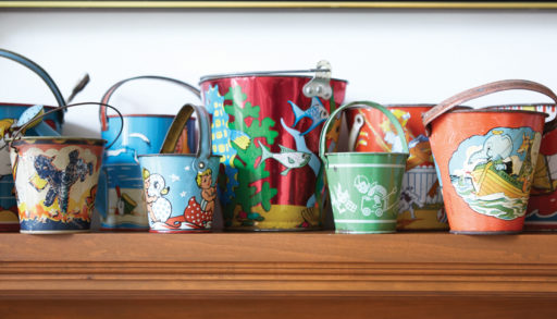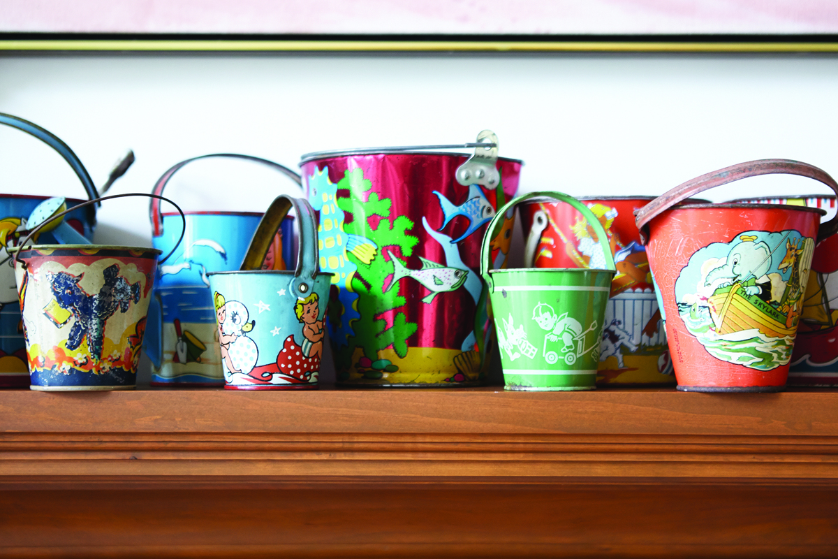 Dyan remembers playing with sand pails when she was a kid too, at her family’s cottage on Lake Simcoe’s Jackson’s Point. “I told myself, ‘If I ever have my own cottage, I want them on my mantel.’ ” It took a while. After renting every summer for 20-plus years, she and Howard finally bought their own place in 2005, and she finally had a home for the sand pails she’d bought—most at the annual antique show in Port Carling, while the couple were renters. A book about collecting them, including prices and dates, sits nearby. But, Dyan says, she didn’t know the book existed when she bought her pails—and, besides, she’s not interested in those things. “Sure, folk collectibles have a value. But I’ve never sold anything.” And why look up dates? Part of her pleasure is figuring out when a pail was made by the hairstyles and the clothing of the children depicted on it.