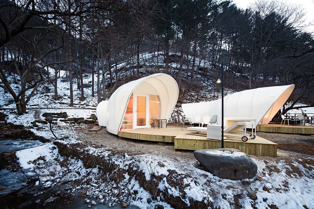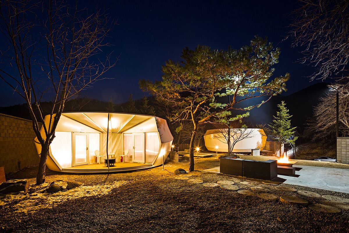 One of the most interesting (and aesthetically pleasing) glamping concepts is in South Korea. A private retreat about 80 kilometres from Seoul, called Glamping on the Rock, is a showcase for the innovative designs of Seoul’s ArchiWorkshop.