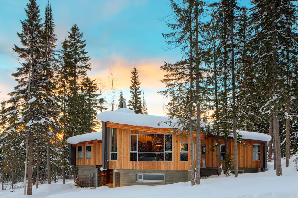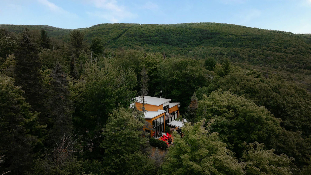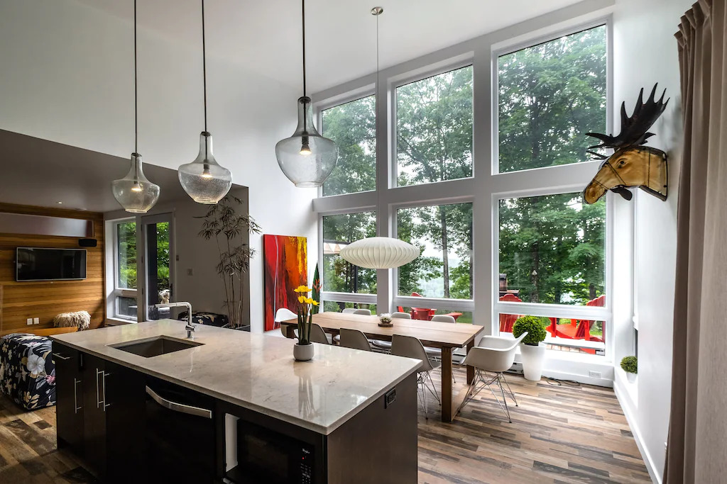Just an hour outside of Montreal you’ll find this contemporary chalet tucked away among the trees. Enjoy the mountain views from the floor-to-ceiling windows.