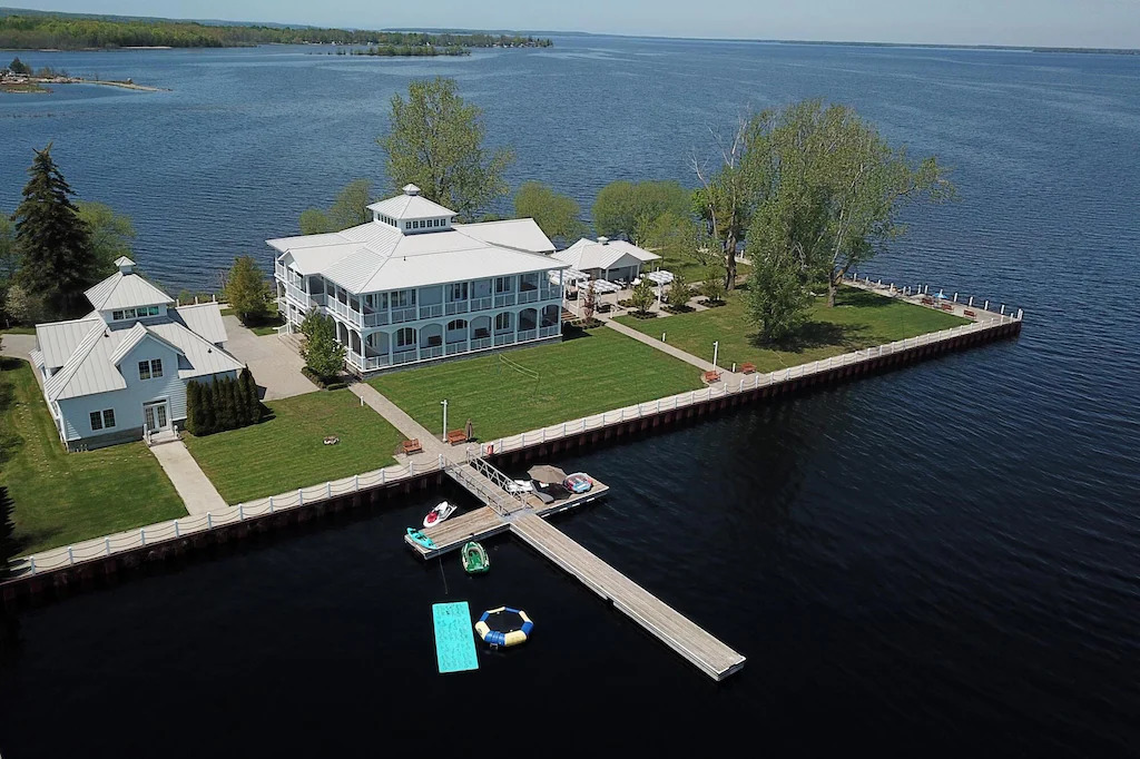 This gated waterfront cottage is surrounded by 320-degree views of the Georgian Bay. The large dock can accommodate multiple boats should you choose to bring yours along. The private guesthouse and lakeside cabana make this property ideal for entertaining large groups.